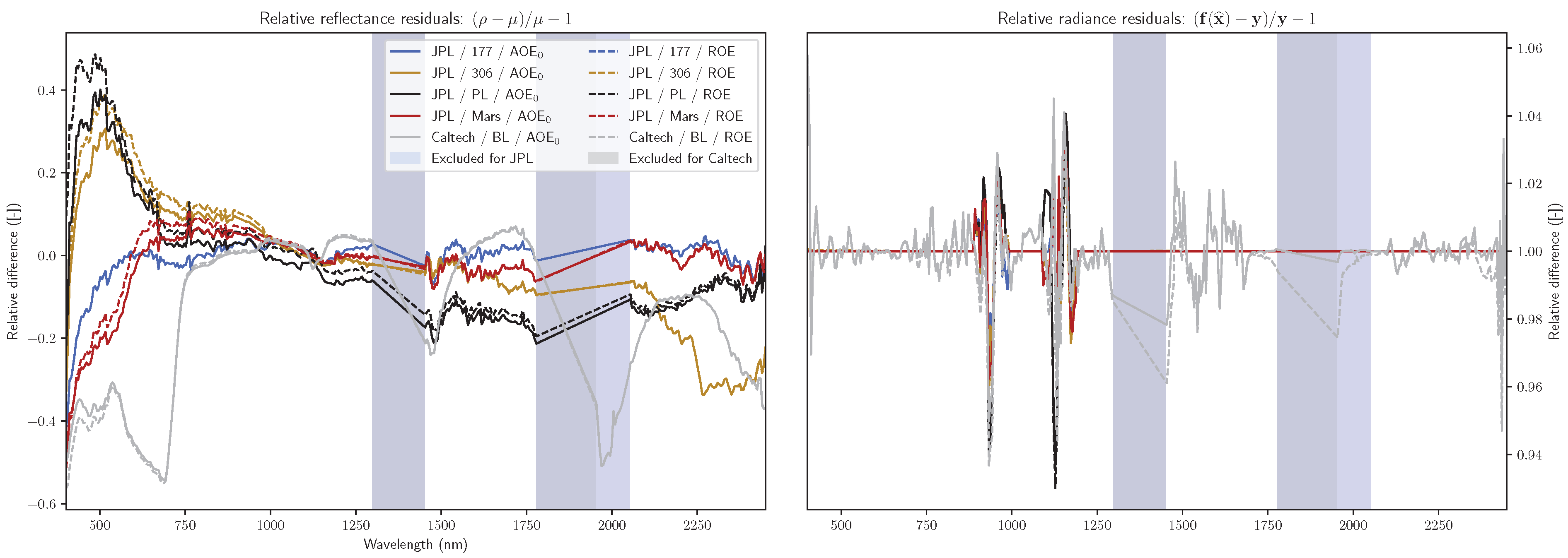 Figure 8 shows that the shapes of the AOE- and ROE-retrieved reflectances were very similar. The last target describes a situation where the ROE retrieval did not converge to the best atmosphere, and this led to both a huge difference between the posterior probabilities and a large maximum relative reflectance difference of 22%. The maximum absolute reflectance difference for the seventh target was 0.044.