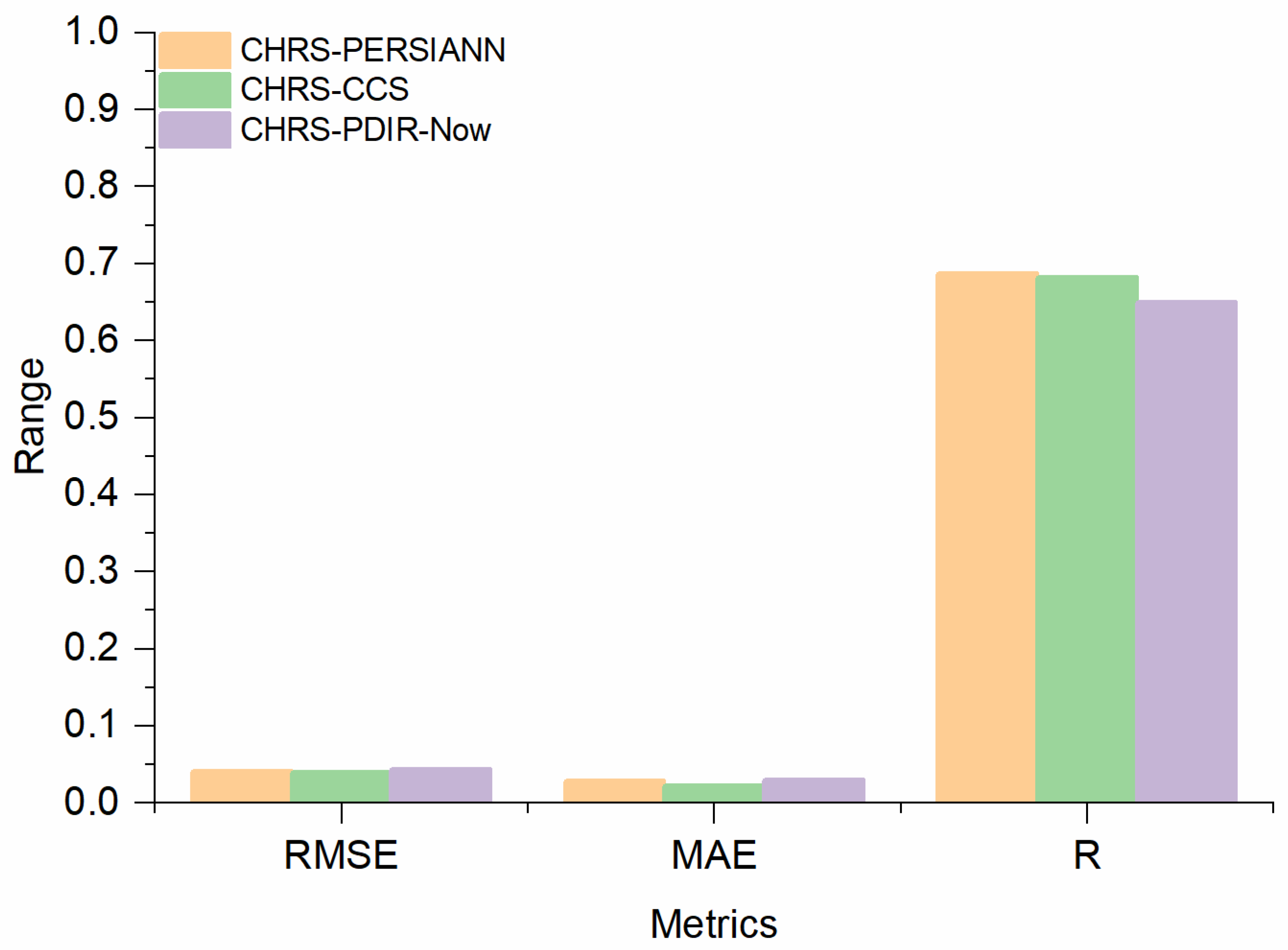 3.5. Overall Performance of the CHRS-PERSIANN, CHRS-CCS, and CHRS-PDIR-Now