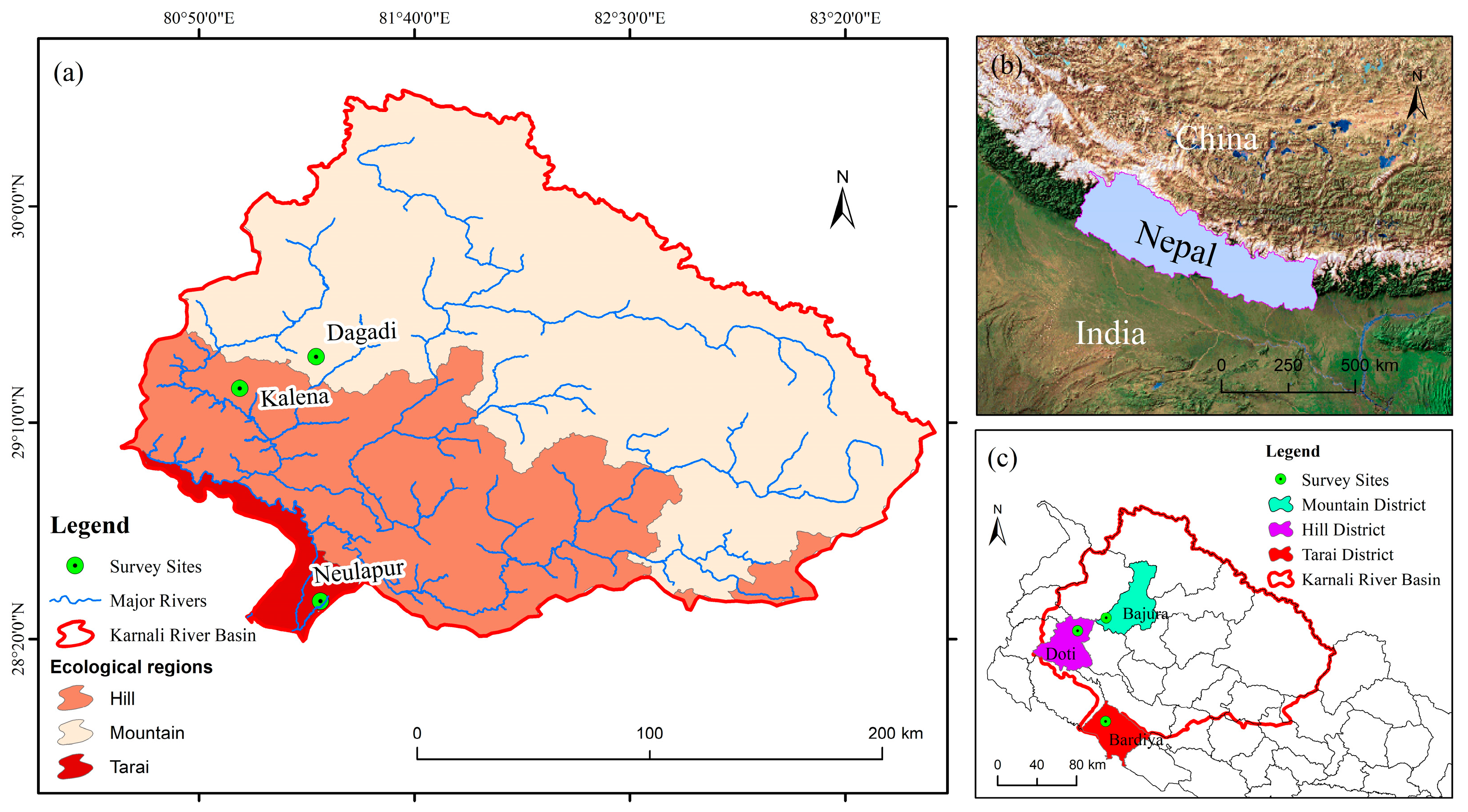 Nepal consists of three distinct ecological regions: the Mountain region in the north, the Hills in the middle, and the Tarai in the south. This work selected one representative village from each region of the Karnali Basin: Dogadi village in the Mountain region from the Bajura District, Kalena village in the Hill region from the Doti District, and Neulapur village in the Tarai region from the Bardiya District (