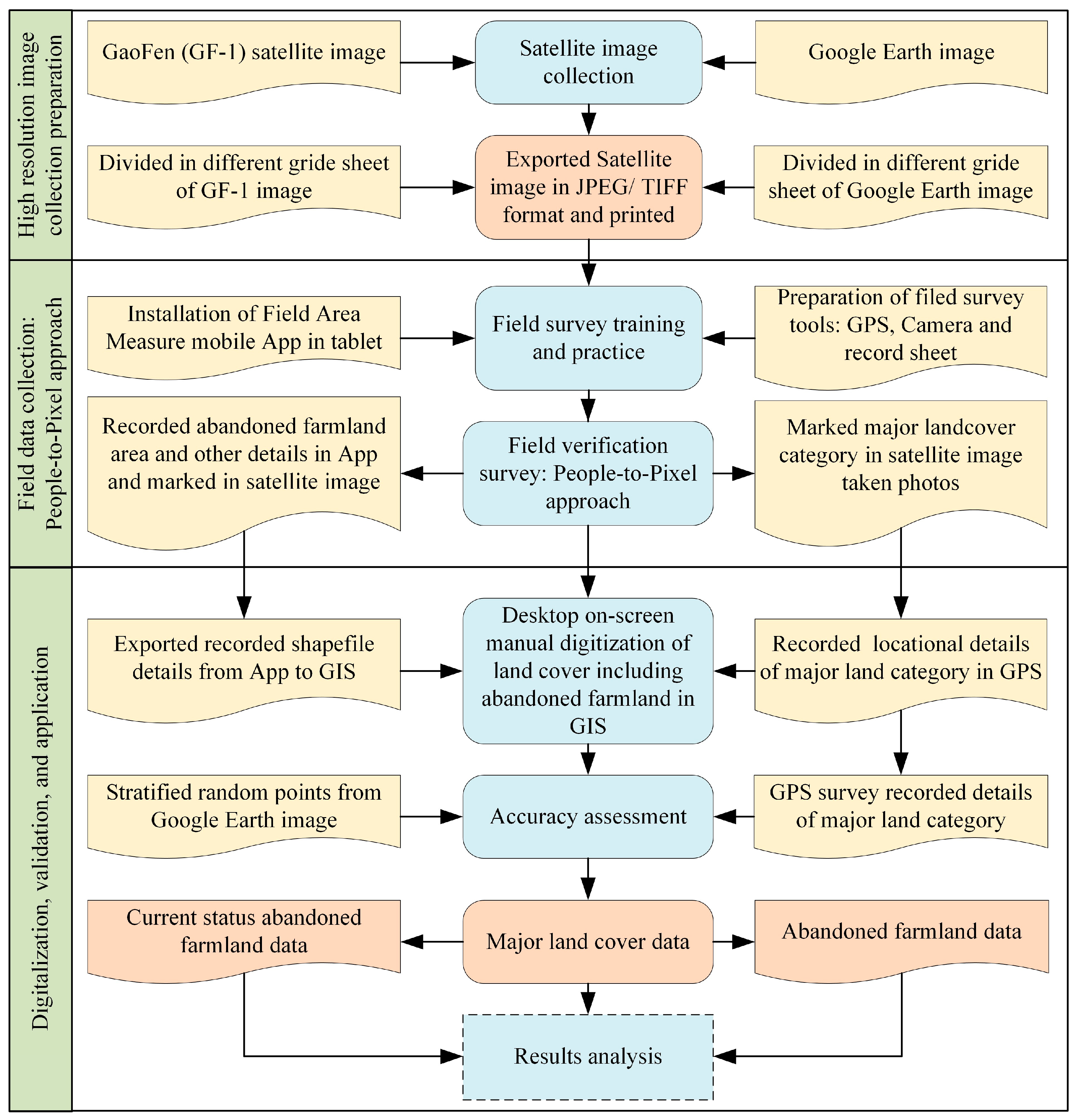 In the people-to-pixel approach, one person used one satellite image grid sheet for verification of each parcel. We surveyed all the active and abandoned farmland in person and recorded the details of the abandoned farmland. We took photos of the abandoned farmland from the ground during the survey, along with photos of other major land-cover types in the study area. The abandonment year of the farmland was asked of the landowner if available; if the landowner was not available, we asked nearby households or community members. Other land-cover types such as dense forest or waterbodies were observed from nearby parcels and marked on the GF-1 satellite images. If the GF-1 satellite images were unclear, we used the Google Earth images. As mentioned earlier the main objective of the work is to generate accurate information about the abandoned farmland; thus, we only recorded details of this land-cover type through the app, and all other land-cover types were marked on the GF-1 satellite imagery and later used for land-cover mapping. The detailed methodological framework is presented in
