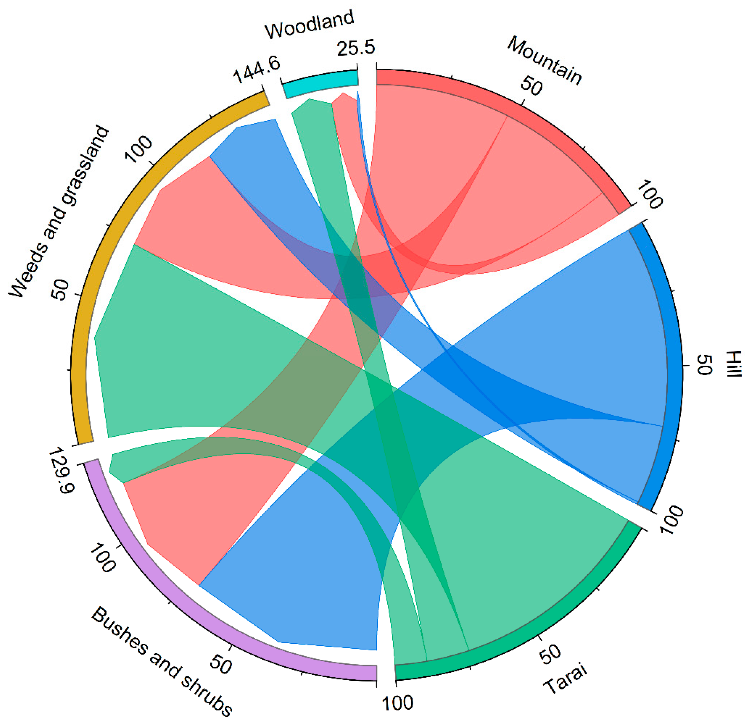 31]. The abandonment of farmland in the Karnali Basin of Nepal presents some challenges. It threatens local food production, which could lead to shortages and increase food insecurity in rural areas reliant on agriculture. In addition, the reduction in agricultural activity disrupts livelihoods and limits income for farmers and agrarian communities. Beyond economic impacts, abandoned farmland contributes to environmental degradation, such as soil erosion and biodiversity loss, which alters local ecosystems and strains natural resources [
