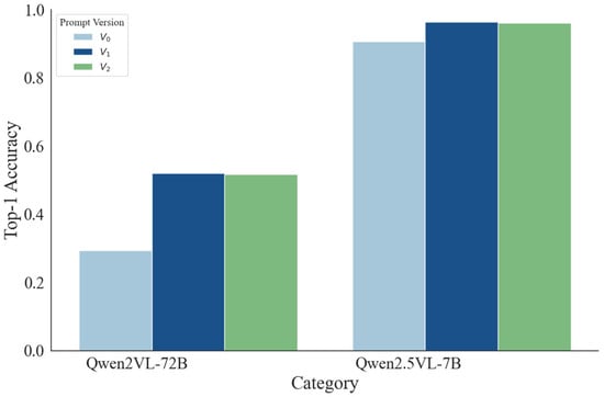 As illustrated in Table 4 and Figure 3. Top-1 accuracy comparison between different prompt versions, we compare three prompt versions (V0–V2) with Qwen2VL-72B and Qwen2.5VL-7B, both fine-tuned using LoRA and evaluated in the ms-swift framework. V0 is a generic, unstructured instruction; V1 introduces explicit coarse→fine hierarchical cues aligned with the label taxonomy; V2 preserves the same hierarchical content as V1 but expresses it in a more compact format. Across both model scales, the decisive factor is the presence of hierarchical guidance: moving from V0 to V1 increases Top-1 accuracy from 29.33% → 52.00% on Qwen2VL-72B and from 90.67% → 96.44% on Qwen2.5VL-7B, whereas changing formatting alone (V1→V2) yields only marginal differences (51.78% vs. 52.00% for 72B; 96.11% vs. 96.44% for 7B). These results indicate that structuring the decision process to mirror the label hierarchy—rather than cosmetic prompt reformatting—drives the gains, with noticeable error reductions in categories prone to cross-group confusion (e.g., Transportation and Infrastructure, Urban/Man-made).