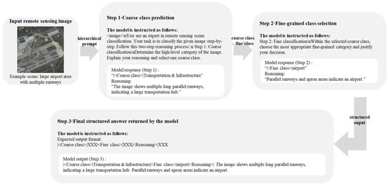 Prompt engineering has emerged as a crucial technique for adapting pretrained VLMs to downstream tasks without requiring extensive retraining. Structured prompt designs have been shown to significantly influence model outputs by steering attention and reasoning pathways [15,16]. Hierarchical reasoning strategies [17,18], which decompose complex classification tasks into sequential sub-decisions, further align model processing with human cognitive mechanisms and have been successfully applied in Few-shot and multimodal contexts [19,20,21]. These approaches suggest that the way the task is asked—for example, through a coarse-to-fine taxonomy or stepwise instructions—can be as important as the backbone itself. However, most existing prompting strategies in remote sensing either (i) assume a flat label space, or (ii) do not explicitly exploit hierarchical structure in land-cover semantics.