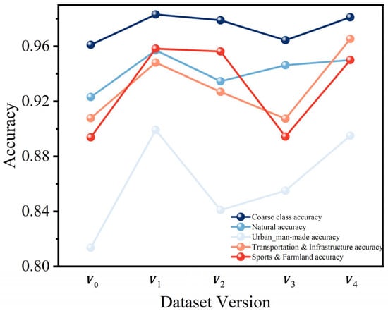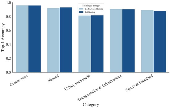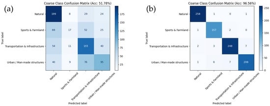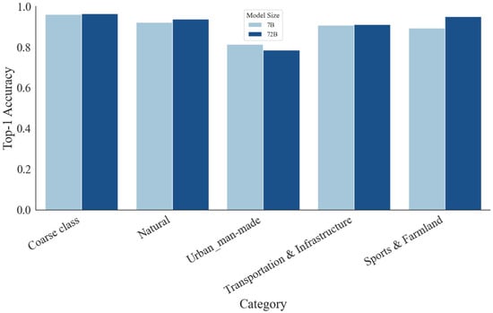 To evaluate the performance of the models, we primarily adopted Top-1 accuracy and macro-F1-score as the metric for both coarse-classification and fine-classification tasks. Coarse-classification accuracy measures the model’s ability to correctly classify images into high-level categories such as Natural, Urban/Man-made, Transportation and Infrastructure, and Sports and Farmland. Fine-grained accuracy evaluates the correctness within each coarse category, targeting specific subclasses. Additionally, we report per-category coarse accuracy to analyze model performance across different scene types. All results are reported on the validation set corresponding to each dataset split.