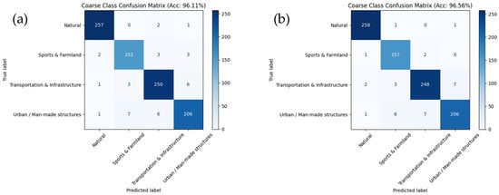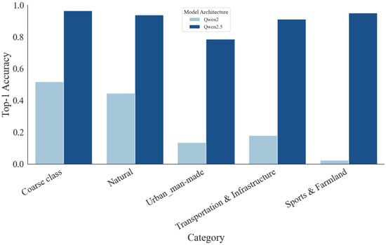 To isolate the effect of architecture, we compare Qwen2VL-72B with its upgraded variant Qwen2.5VL-72B, both fine-tuned via LoRA under 4-bit quantization with an identical prompting/training protocol. As shown in Table 5, Figure 5 and Figure 6, the upgraded model delivers a substantial gain in coarse-level classification, raising Top-1 accuracy from 51.78% to 96.56% (+44.78 pp). Consistent improvements appear in every coarse category: Natural improves from 44.62% to 93.85%, Urban/Man-made from 13.64% to 78.64%, Transportation and Infrastructure from 18.08% to 91.15%, and Sports and Farmland from 2.50% to 95.00%. The coarse-level confusion matrices show markedly cleaner diagonals and far fewer cross-group confusions for Qwen2.5VL, particularly within classes that are small-scale or visually ambiguous, whereas Qwen2VL exhibits frequent misallocations across these groups. Taken together, these results indicate that the architectural advances in Qwen2.5VL—enhancing multimodal representation and vision–language alignment—are pivotal for robust remote-sensing scene understanding under the same fine-tuning and quantization budget.