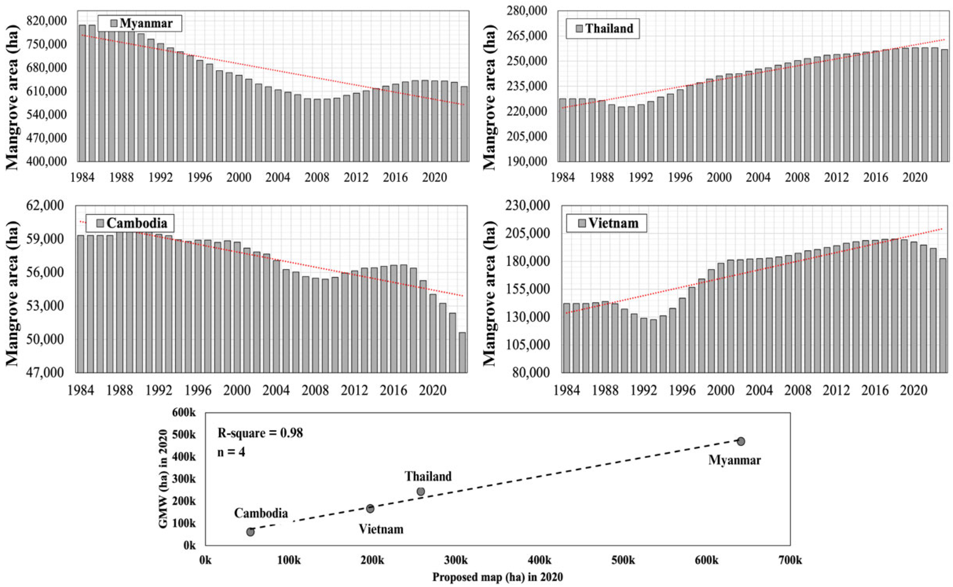 Conversely, Thailand demonstrated a consistent pattern of growth in mangrove coverage, with the area expanding from approximately 227,579 ha in 1984 to nearly 256,873 ha in 2023. Vietnam also showed a notable increase in mangrove areas, rising from around 142,106 ha in 1984 to just under 182,407 ha in 2023. Despite some years where the coverage decreased slightly, the general trend shows a robust increase in mangrove areas over the studied period. Additionally, when comparing the GMW product with the proposed map for 2020, a strong agreement was observed at the country scale (n = 4), with a coefficient of determination (R2) of approximately 0.98.