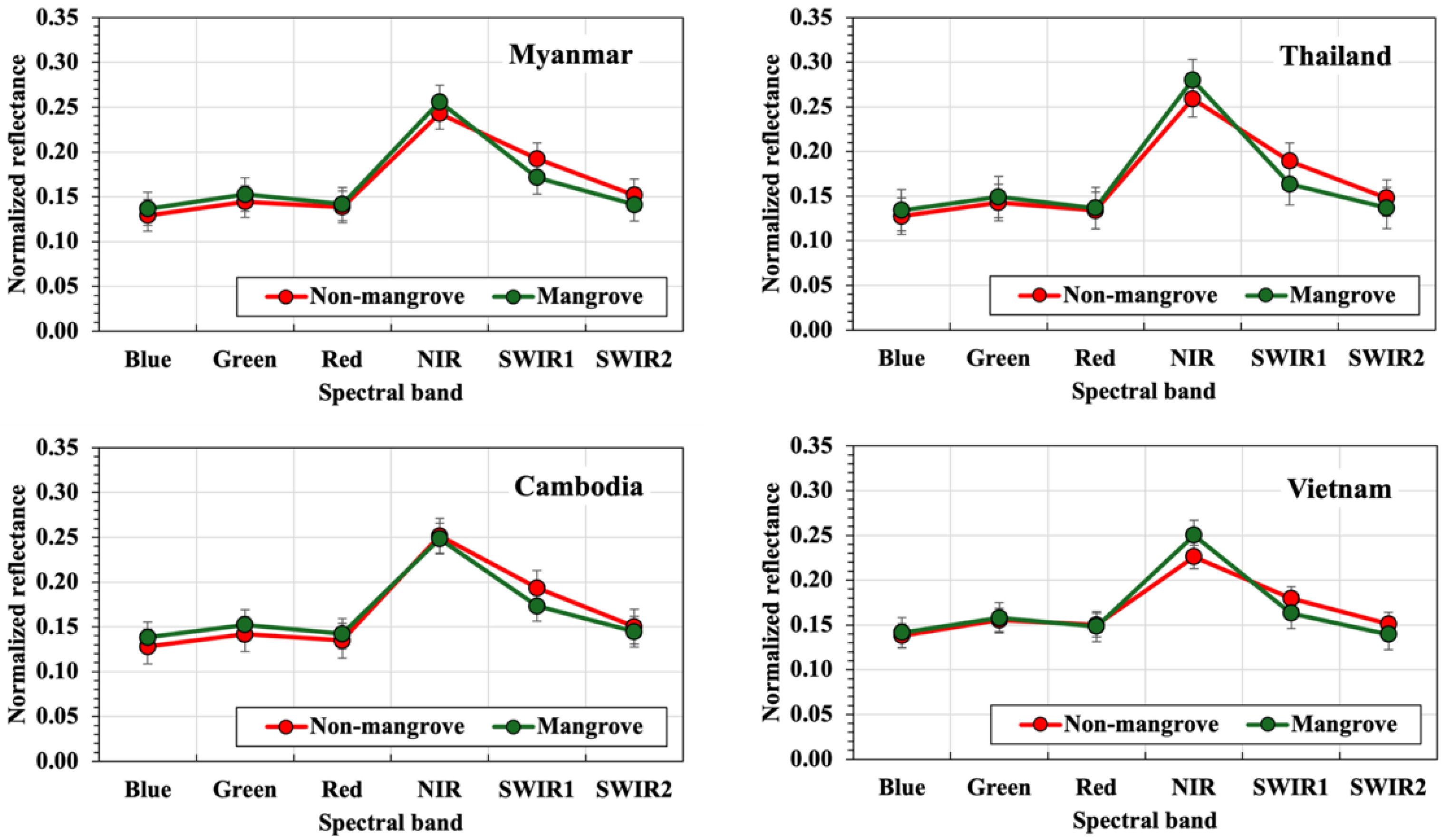 Figure 8. Reflectance of mangrove and non-mangrove areas from distinctive areas based on 6 spectral bands of Landsat from data collection samples. The standard error bar indicates the mean normalized reflectance calculated country by country.