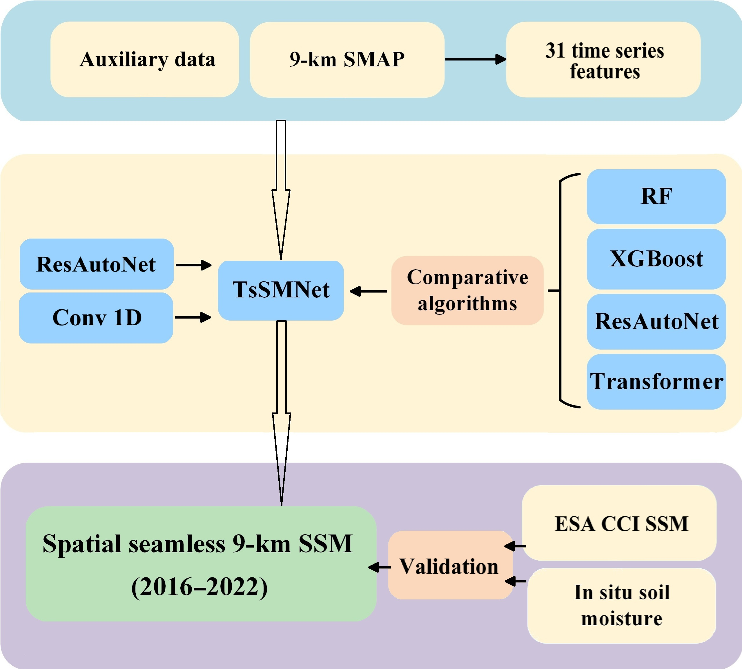 - Developed TsSMNet, a residual autoencoder model that reconstructs gap-free 9 km SMAP soil moisture from 2016 to 2022 in China using multi-source remote sensing data and time-series statistical features.