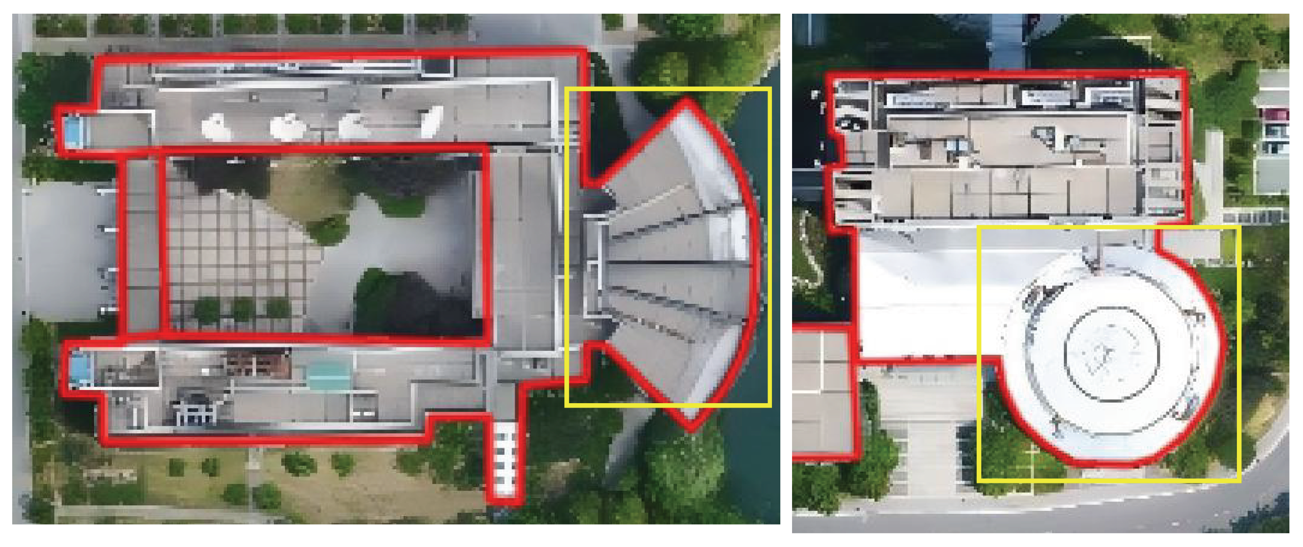 It should be noted that the proposed method still has certain limitations for curved or circular buildings: line segment detection tends to approximate curved boundaries as a large number of short line segments, thereby reducing the overall geometric smoothness (see