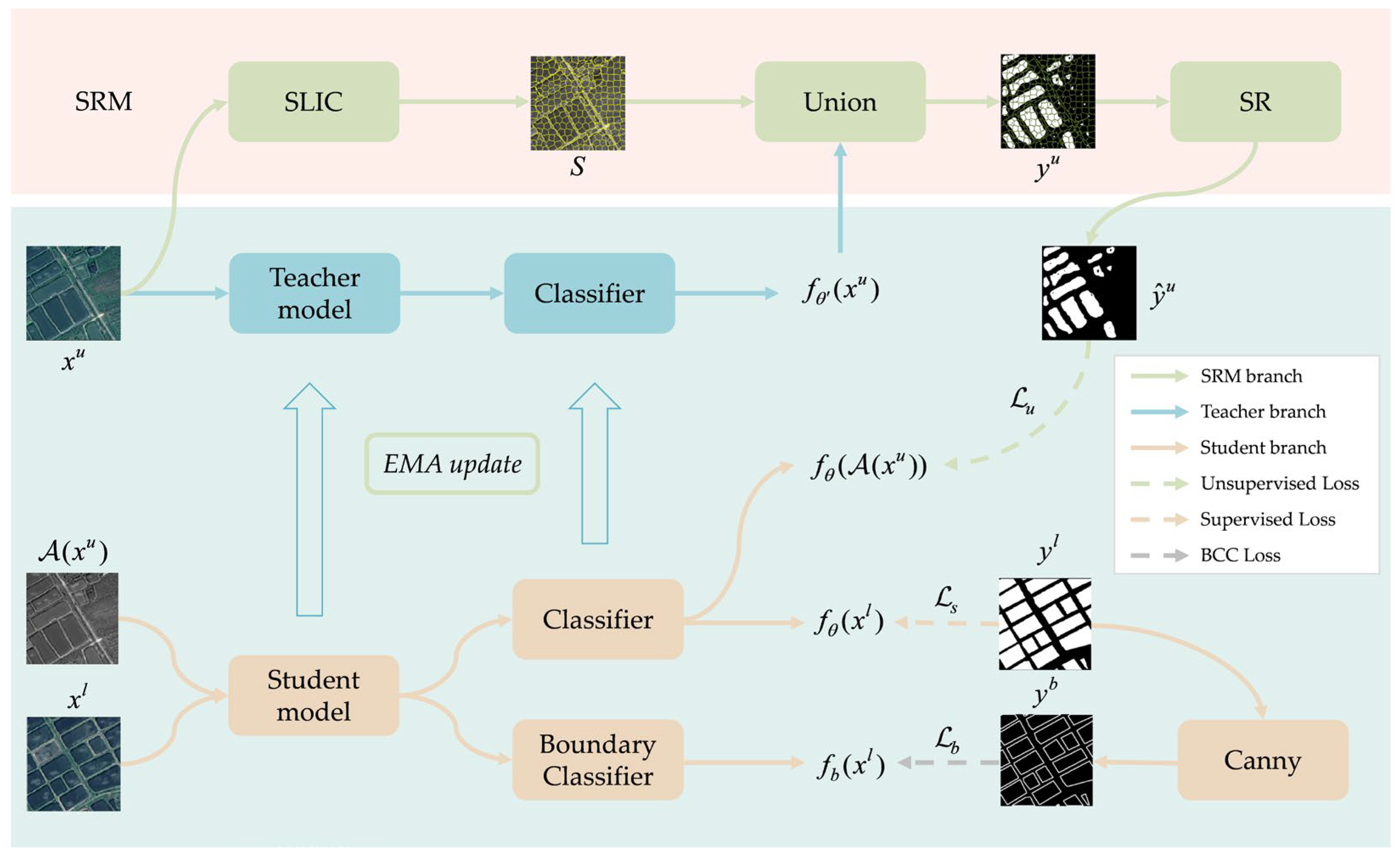 44. Yi, Z.; Wang, Y.; Zhang, L. Revolutionizing Remote Sensing Image Analysis With BESSL-Net: A Boundary-Enhanced Semi-Supervised Learning Network. IEEE Trans. Geosci. Remote Sens. 2023, 61, 5620215. [Google Scholar] [CrossRef]