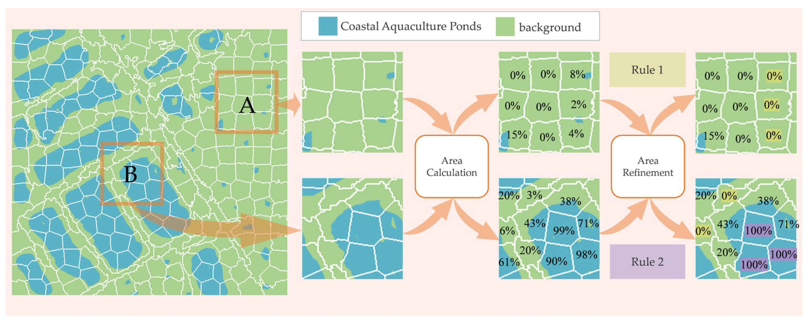 Figure 6. SR algorithm process. Calculate the proportion of aquaculture pond area within each superpixel in each region, and then refine the superpixels using two rules. (A) Shows the application area of rule 1: If the coverage area of aquaculture ponds within a superpixel is less than τ min of the total area, the corresponding aquaculture area will be removed. (B) Shows the application area of rule 2: If the coverage area of aquaculture regions within a superpixel exceeds τ max , all pixels within that superpixel will be classified as aquaculture ponds.