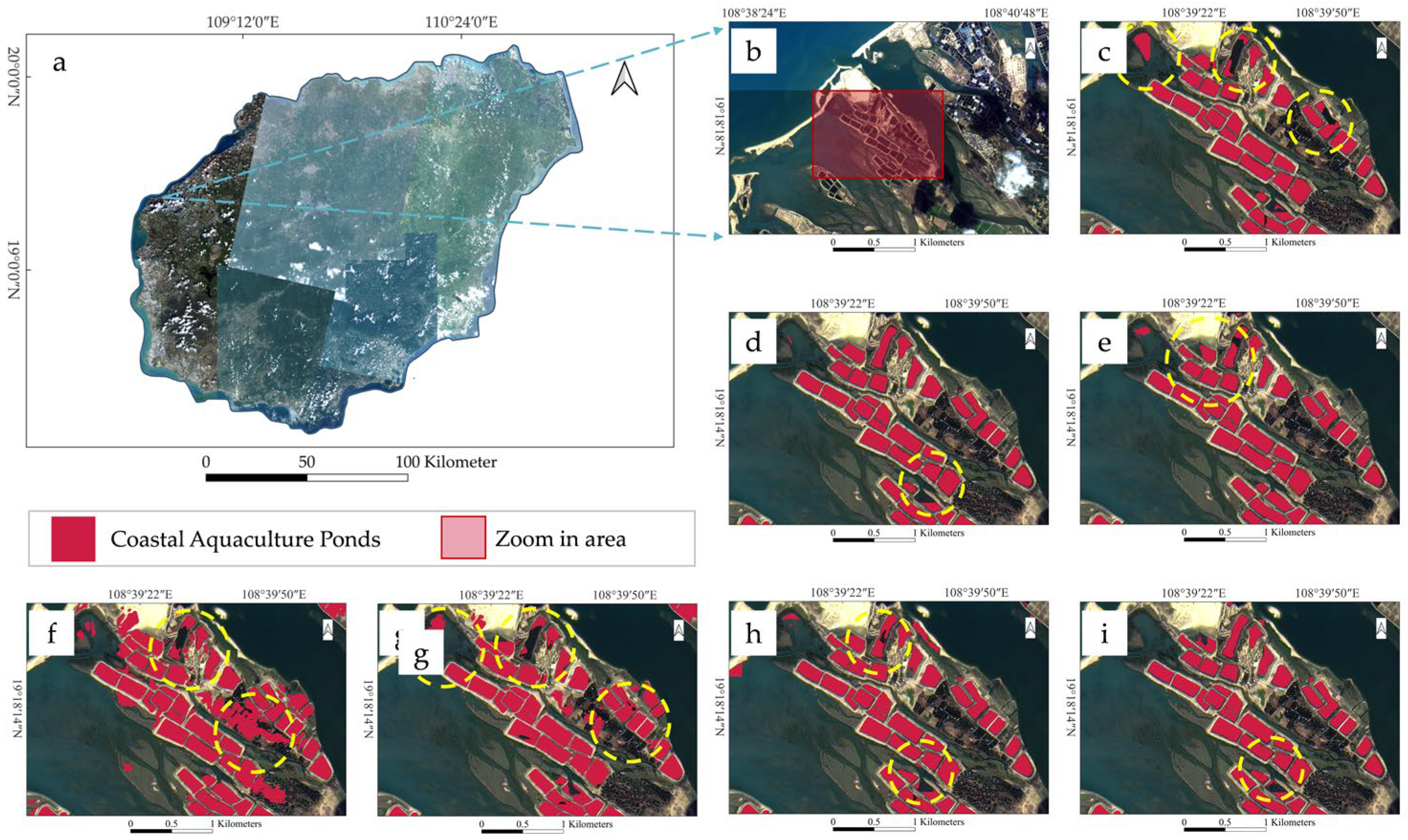 Figure 10. A qualitative comparative analysis of the results obtained from different advanced semi-supervised learning models for extracting aquaculture ponds in semi-enclosed sea scenarios under a 1/2 unlabeled data ratio condition. (a) Distribution of semi-enclosed sea scenarios; (b) Original imagery; (c) CCT; (d) GCT; (e) CPS; (f) FixMatch; (g) UniMatch; (h) SupOnly; (i) Semi-BSU. Yellow dashed circle indicates areas with severe misclassification of aquaculture ponds, while yellow dashed rectangles indicate areas with severe boundary adhesion of aquaculture ponds.