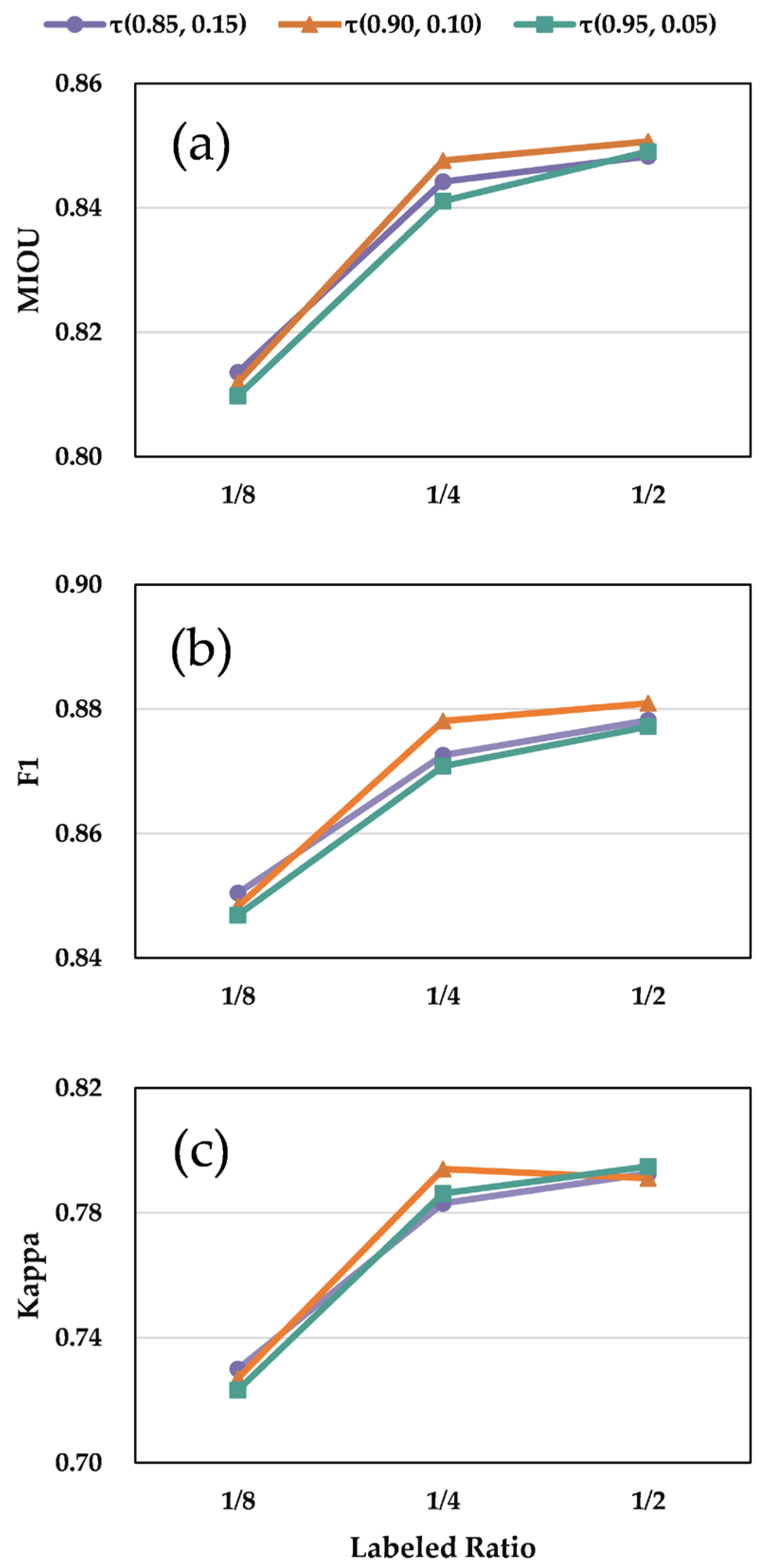 Figure 13. Performance comparison of the SRM under different threshold combinations—τ(0.85, 0.15), τ(0.90, 0.10), and τ(0.95, 0.05)—across three labeled ratio scenarios: (a) MIOU metric; (b) F1 metric; (c) Kappa metric.