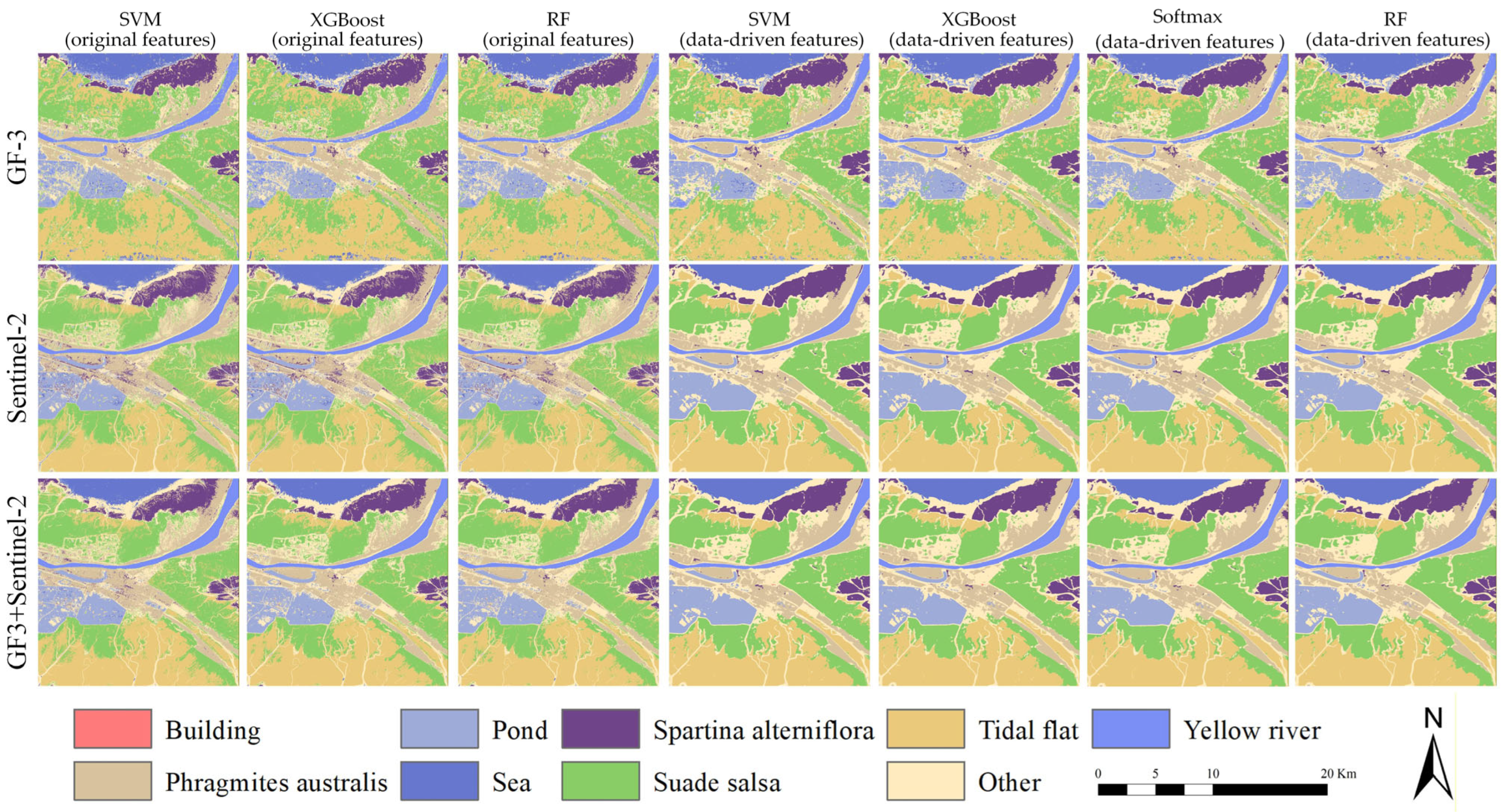 - Xing, H.; Niu, J.; Feng, Y.; Hou, D.; Wang, Y.; Wang, Z. A coastal wetland mapping approach of Yellow River Delta with a hierarchical classification and optimal feature selection framework. Catena 2023, 223, 106897. [Google Scholar] [CrossRef]