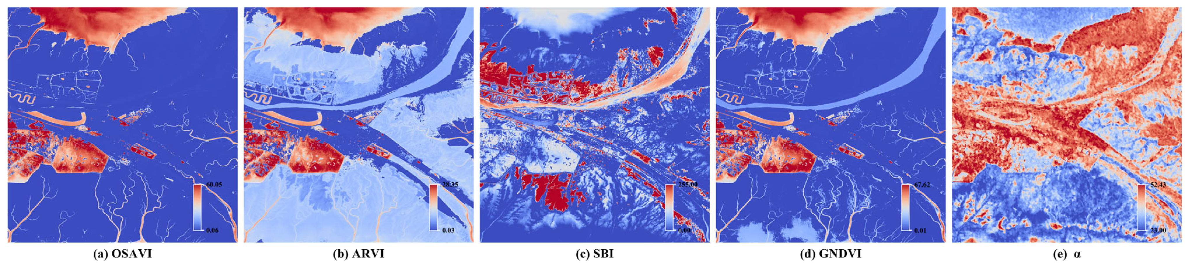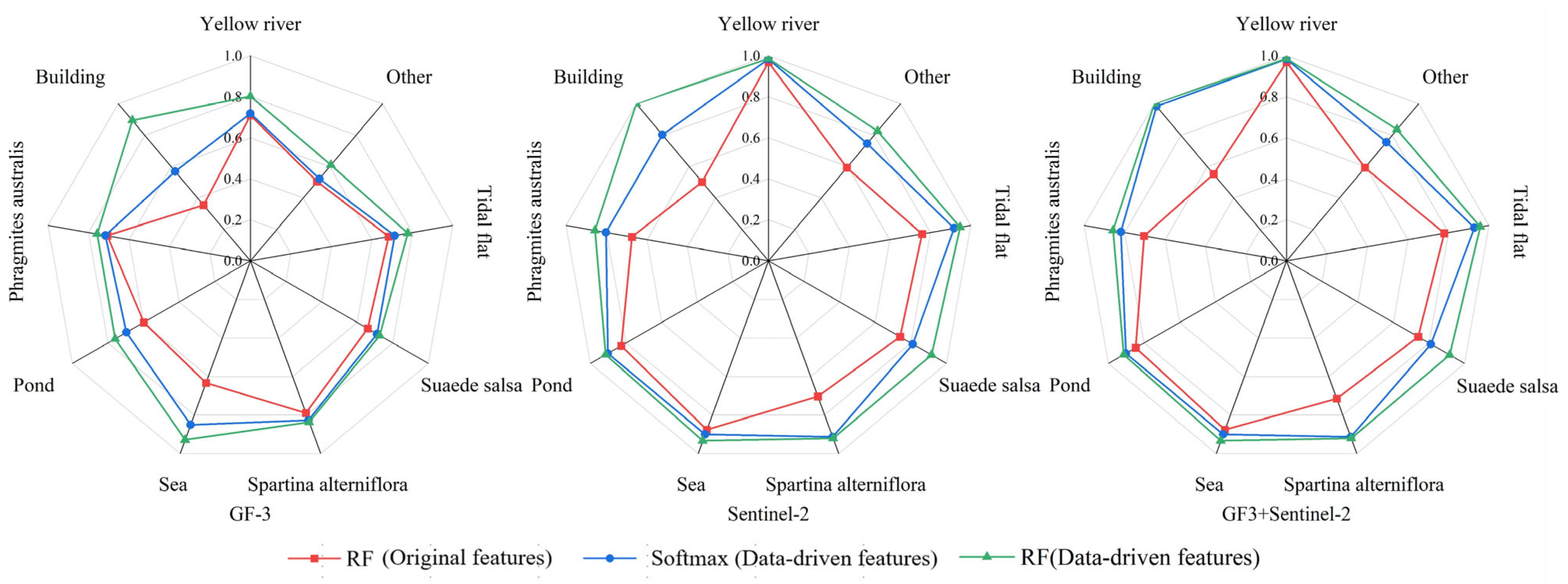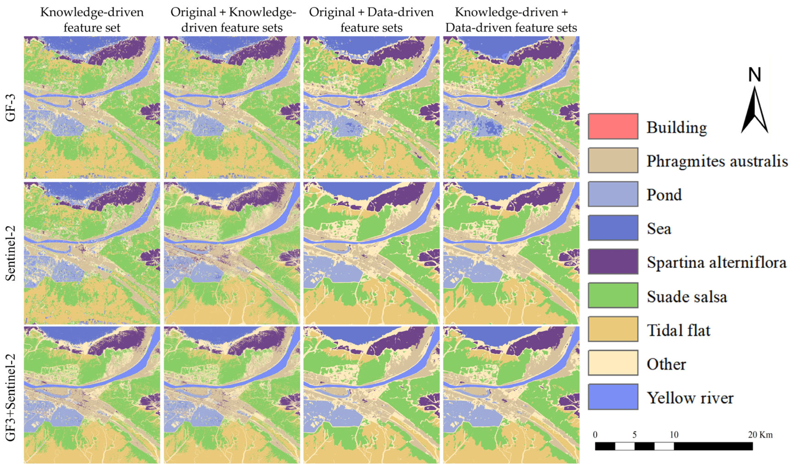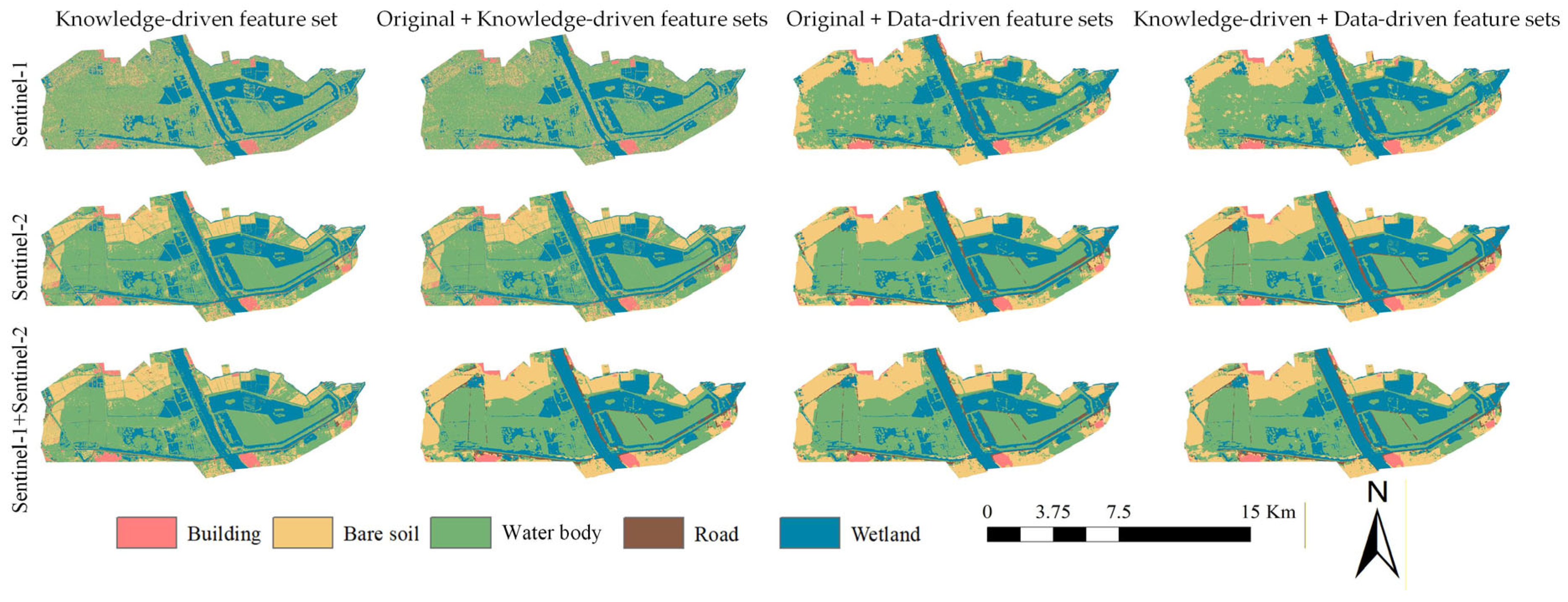 - A unified multi-feature framework is developed by systematically integrating knowledge-driven and data-driven features. This integration enables the joint utilization of physically interpretable and abstract representations, resulting in a more comprehensive and balanced characterization of diverse wetland land cover categories.
