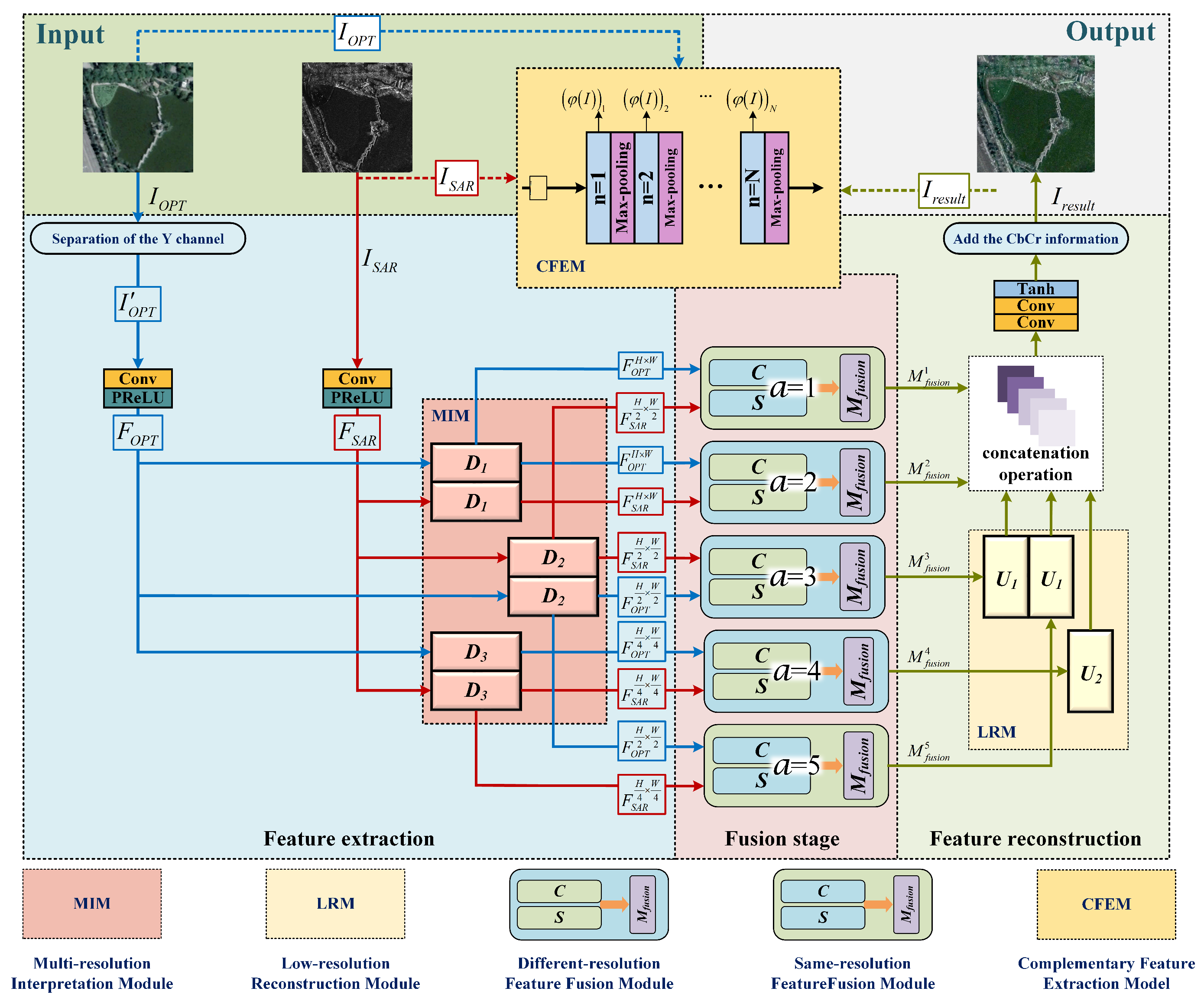 - A Multi-Resolution Layered Fusion Network (MRLF) is proposed for optical and SAR image fusion. Its multi-resolution module decomposes input features into distinct levels to capture details and semantic information, while intensity and gradient terms ensure controllable fusion across resolutions.