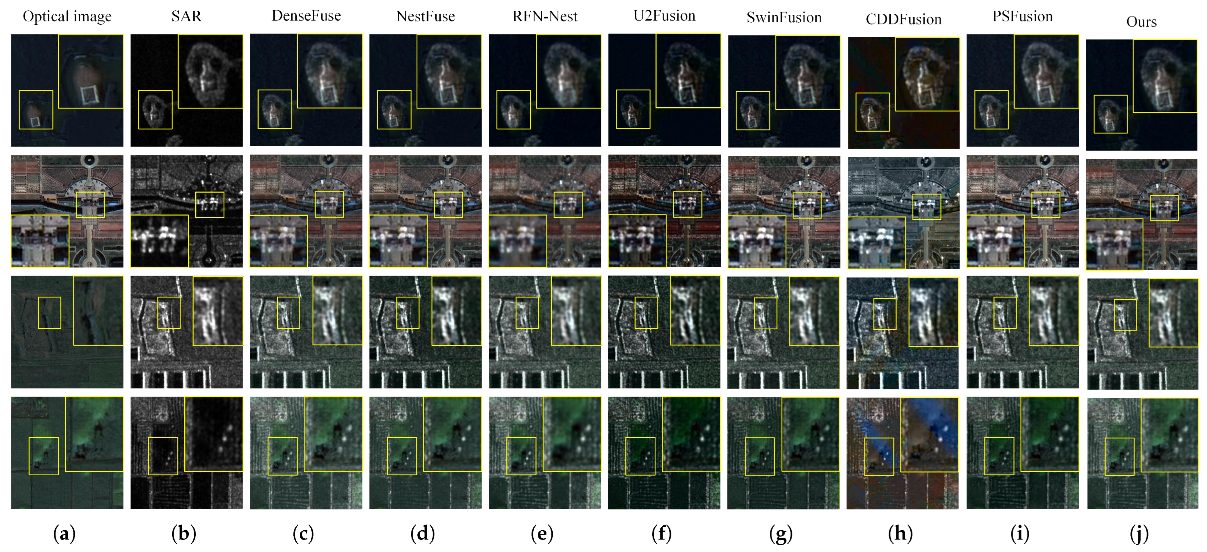 - Ye, Y.; Zhang, J.; Zhou, L.; Li, J.; Ren, X.; Fan, J. Optical and SAR image fusion based on complementary feature decomposition and visual saliency features. IEEE Trans. Geosci. Remote Sens. 2024, 62, 5205315. [Google Scholar] [CrossRef]