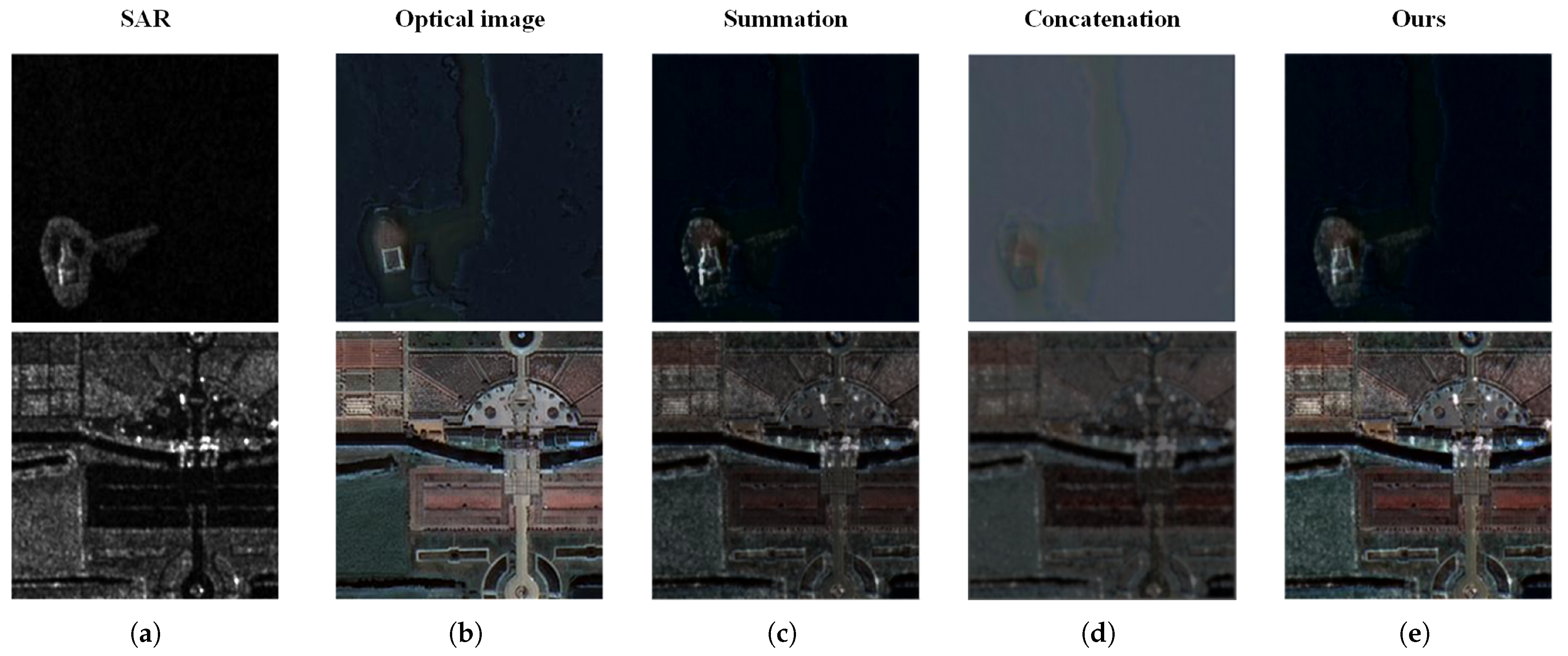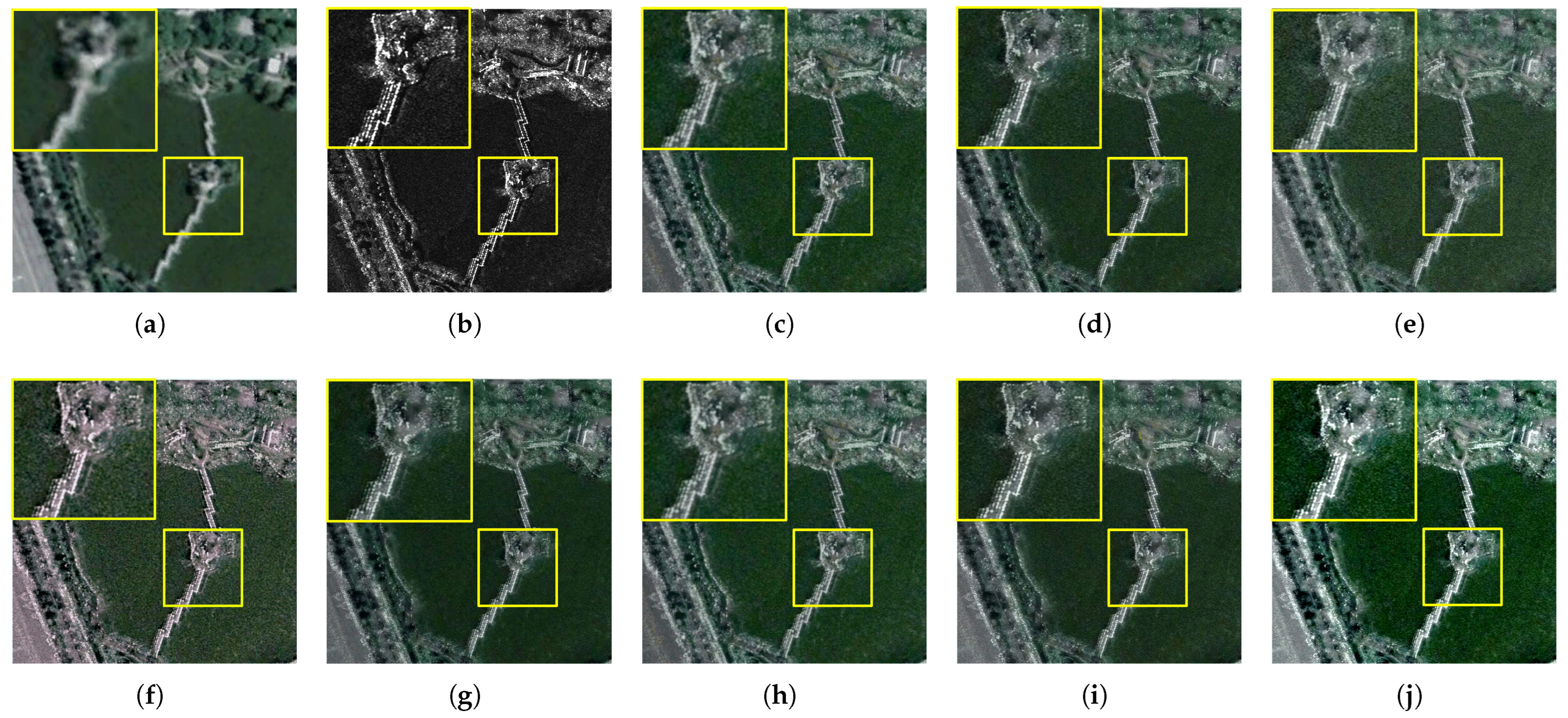 - Tianyong, C.; Yumin, T.; Qiang, L.; Bingxin, B. Novel fusion method for SAR and optical images based on non-subsampled shearlet transform. Int. J. Remote Sens. 2020, 41, 4590–4604. [Google Scholar]