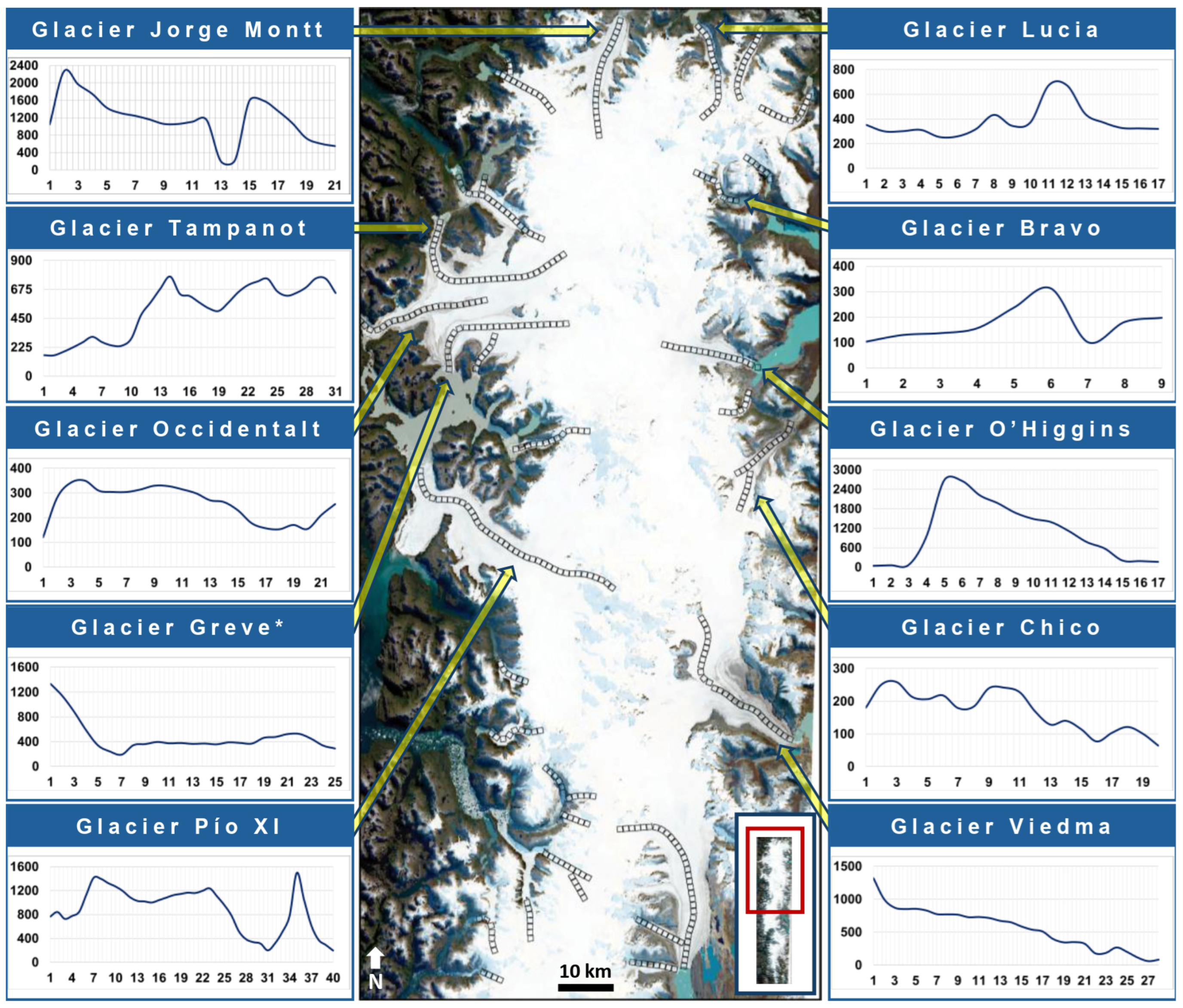 - Multiple-peak velocity profile: There are several peaks in the velocity profile, i.e., the glacier has several segments of high velocity and several segments of low velocity.Glaciers: Amalia, Bernard, Chico, Greve, Grey, Guilardi, HPS13, HPS19, HPS29, HPS9, Jorge Montt, Lucia, Mayo, Moreno, Occidentalt, Ofhidro, Pío XI, Spegazzini, SPI131, SPI204, Tampanot, Tindall, Upsala.
