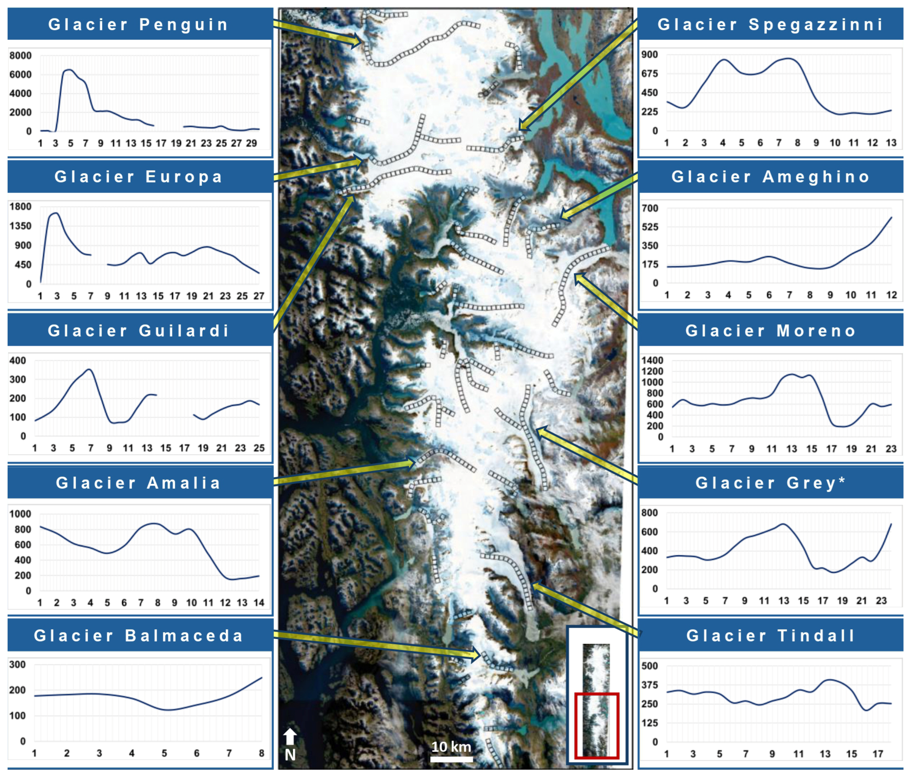 | Muto and Furuya (2013) [43] | Jorge Montt Moreno Occidental O’Higgins Pío XI Upsala Viedma | Envisat ASAR | Speckle Tracking | 2003–2011 | 35 days |