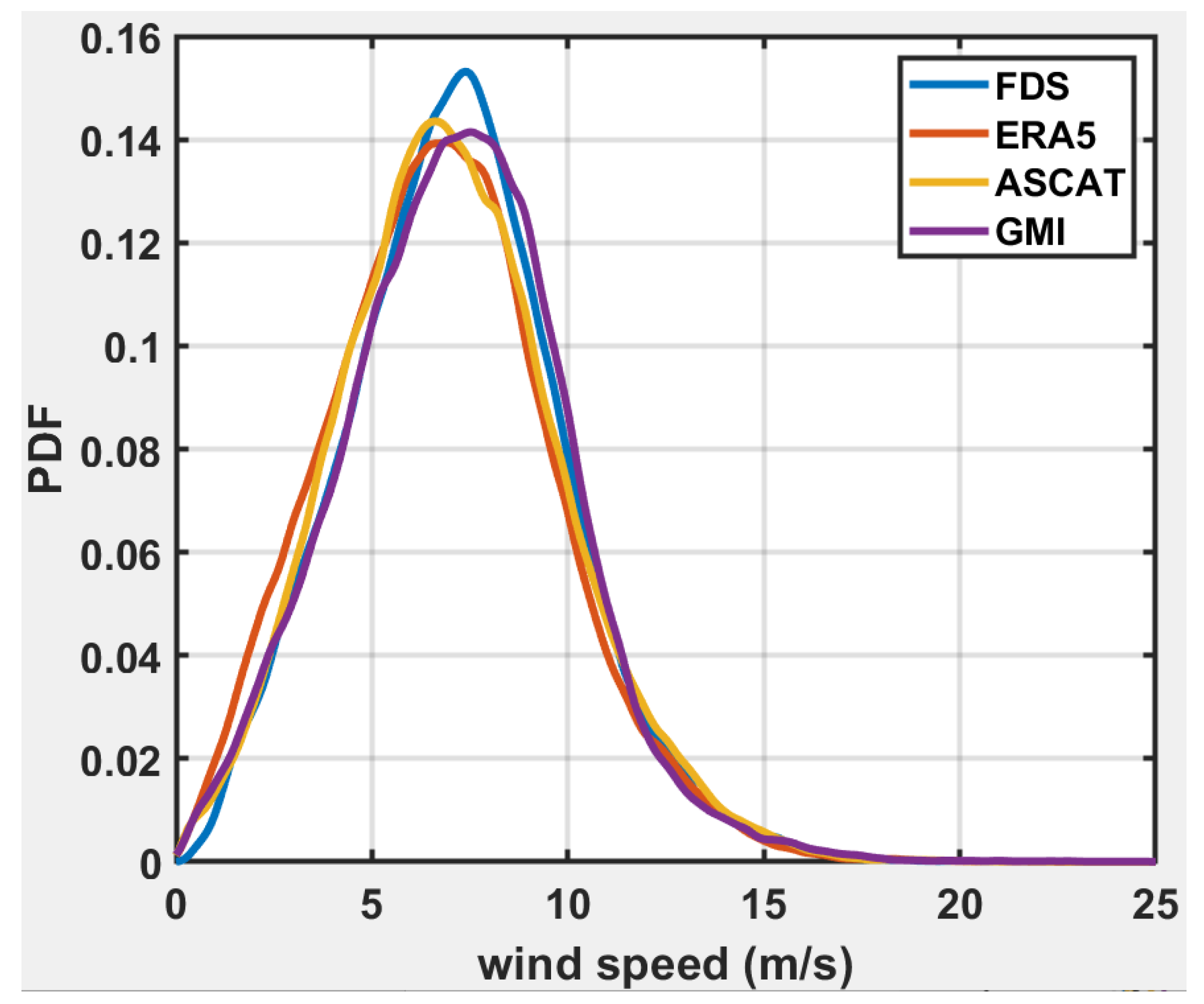 16] is set to a value of 50 or higher to obtain the highest quality matchups with GNSS-R. This dataset contains about 2 million globally collocated measurements for these above-mentioned 4 global ocean wind speed estimates, available over a wind speed range of 0–25 m/s. Despite using stringent quality filters, the 2 million samples in this matchup dataset are sufficient to perform robust statistical analysis.