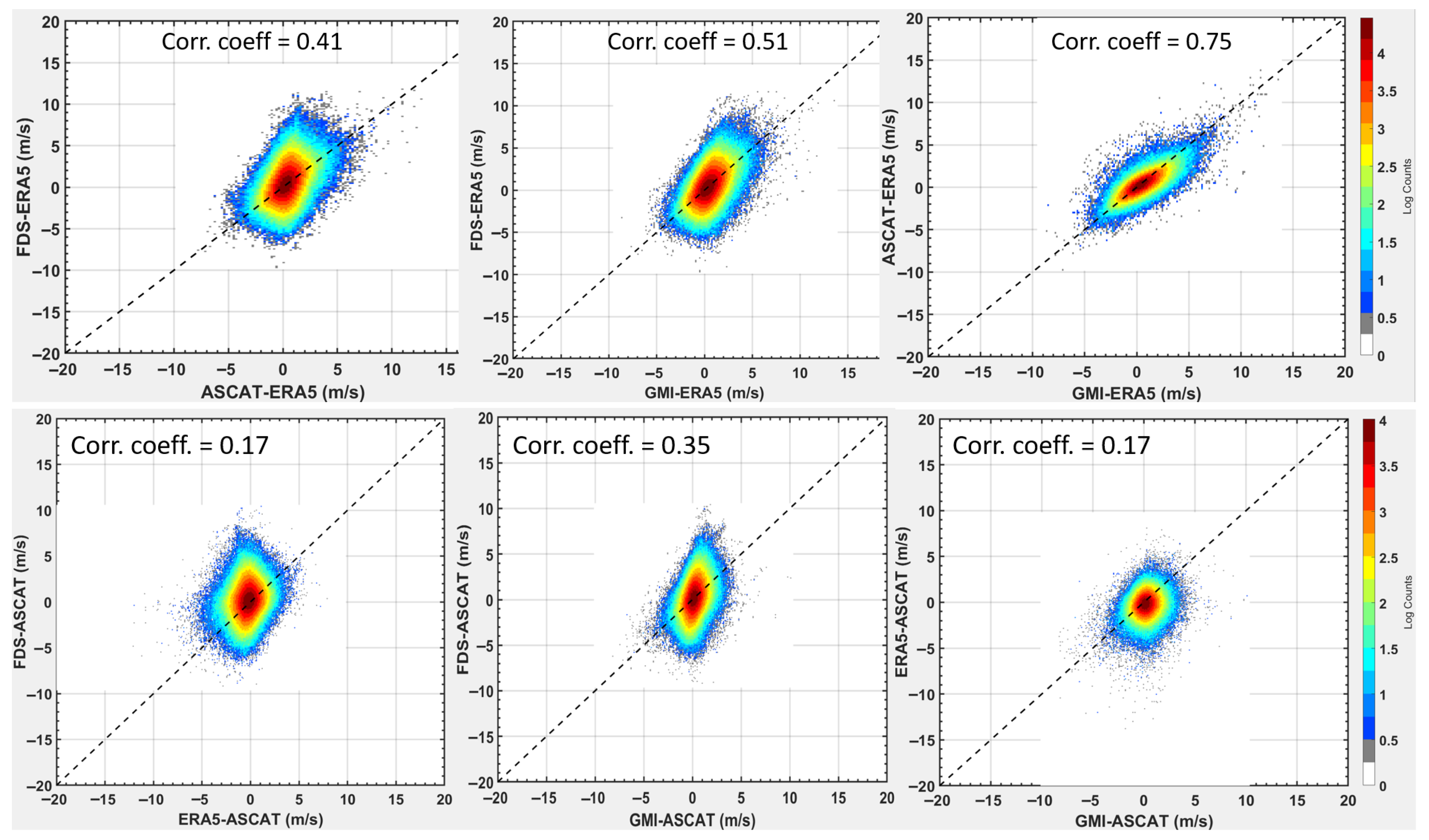 Figure 2 shows density scatter plots comparing the different wind speeds with the reference ERA-5 winds and with the reference as the scatterometer—ASCAT winds. It is important to note here that the ERA-5 reanalysis winds assimilate GMI and ASCAT winds and the CYGNSS Fully Developed Sea (FDS) data product in-turn uses ERA-5 to develop its Geophysical Model Function (GMF). It is common for many of the remote sensing and model reanalysis datasets to be used to calibrate one another, which makes this study particularly important for accurately evaluating the individual errors of the different datasets despite real-world correlations.