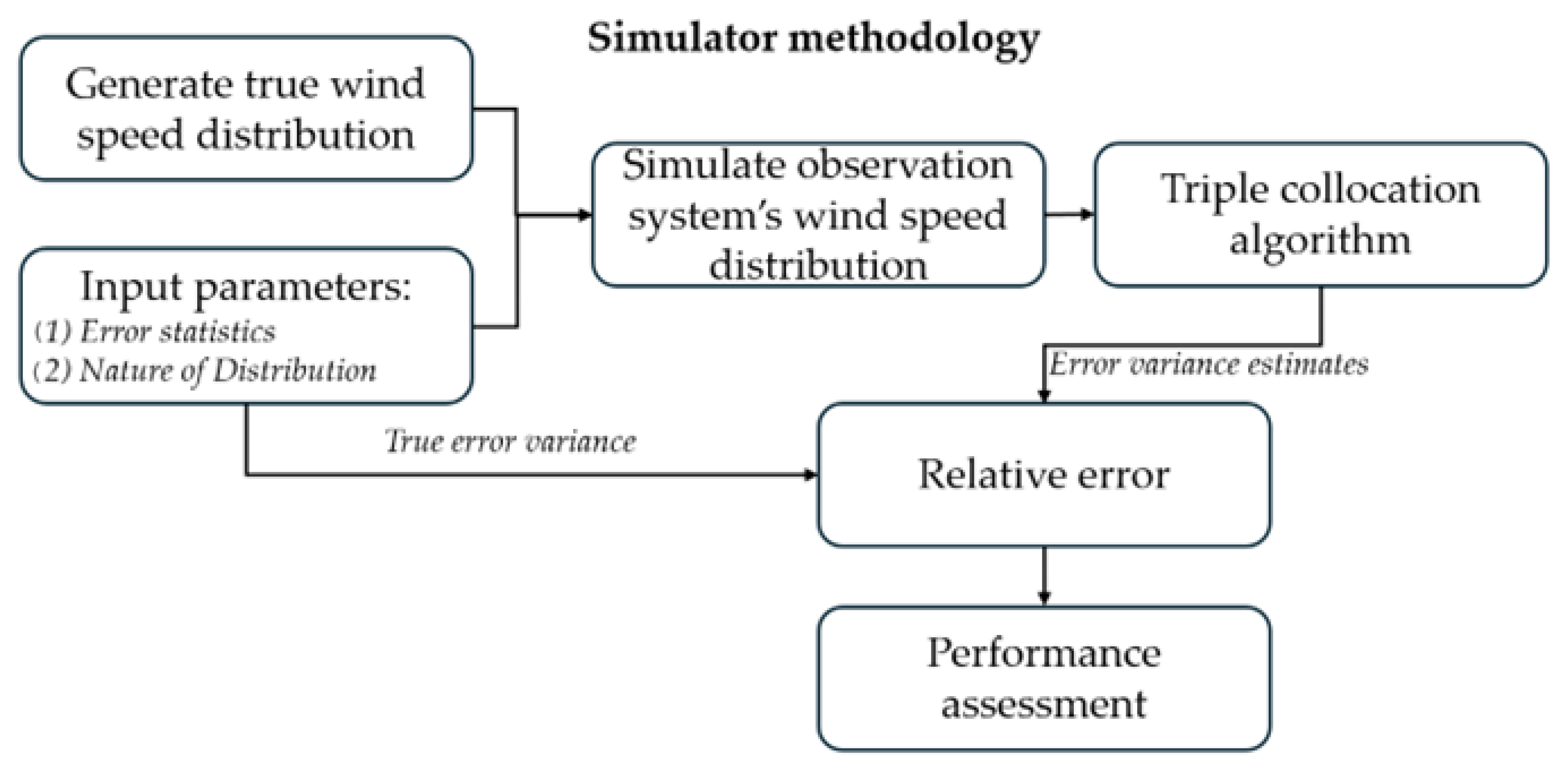 These simulated observations are processed by the triple/N-way collocation algorithm to estimate their absolute error variance. Here, we manipulate various combinations of input variations to assess how accurately the TC algorithm estimates the absolute error variance/standard deviations of individual datasets, even when many of its underlying assumptions are violated. Note that standard deviation represents a physical unit of wind speed (m/s), this is the reason we represent this parameter wherever we can to show how much physical variation occurs. The performance metric used in this study to assess the TC estimation is the relative error, defined as the ratio of the difference between the estimated and actual absolute error variance, divided by the actual absolute error variance. Our primary objective is to violate different underlying assumptions in TC analysis and evaluate how well the algorithm estimates the absolute error variance under these complex, real-world scenarios. The following block diagram summarizes the simulator’s approach.
