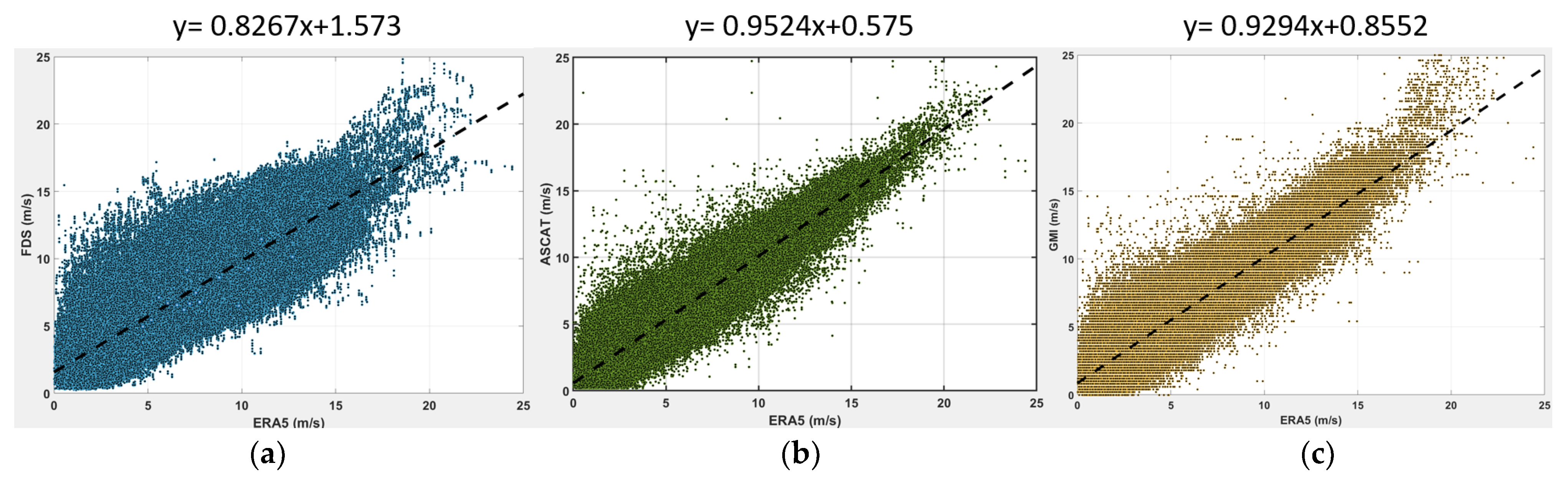 To inform the input parameters for this analysis, we estimate representative values for the scaling factor and bias using the available matchup dataset. Specifically, we treat ERA5 as a quasi-ideal reference system and perform linear regressions on scatter plots between ERA5 and each of the other observation systems: FDS, ASCAT, and GMI. These linear fits, shown in