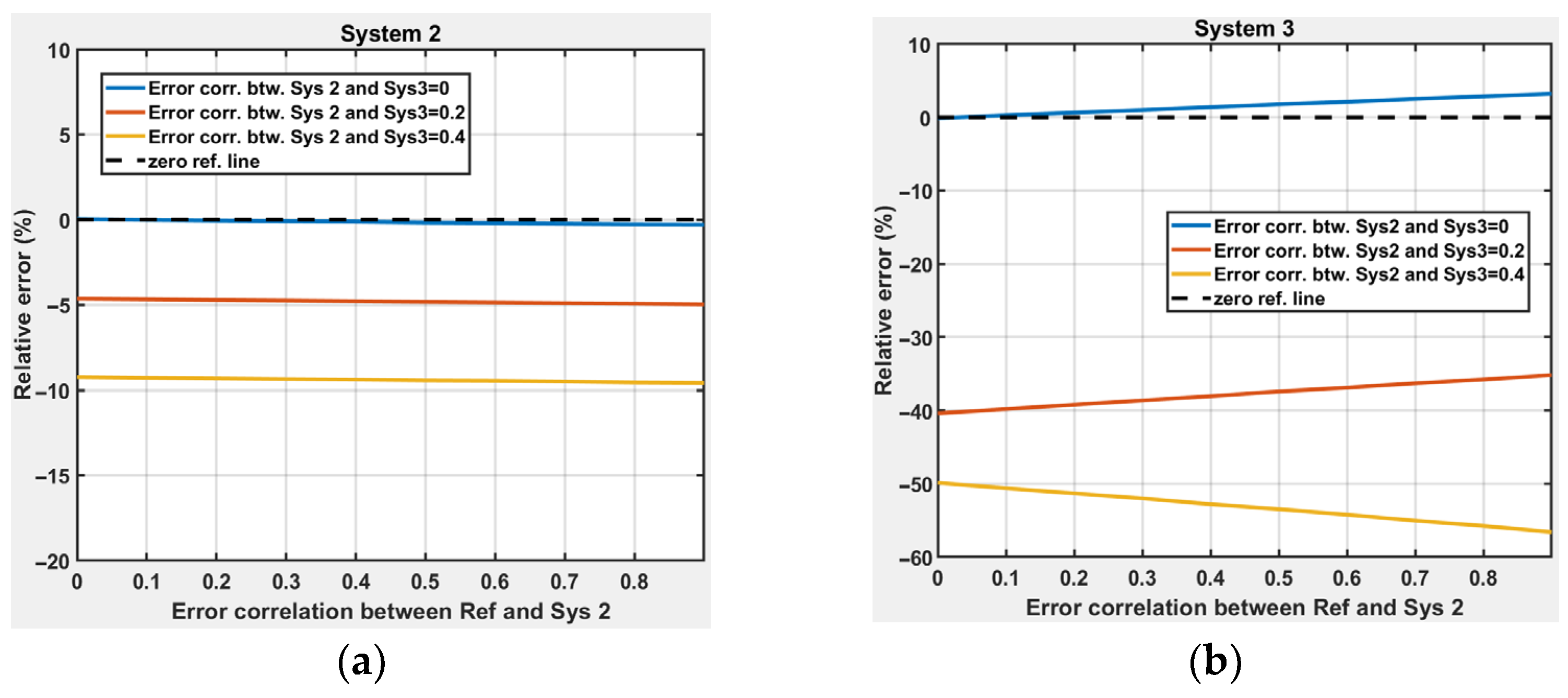 Figure 11. To simplify the analysis and reduce dimensionality, we fix the error correlation between the reference system and System 3 at 10%. We then vary the remaining pairwise correlations—specifically, the correlation between the reference and System 2, and between Systems 2 and 3—across a defined range (0–90%). This approach allows us to generate a set of performance curves that illustrate how combinations of error correlations influence the relative error in estimated error variances. The resulting visualization helps identify safe operational zones for applying TC and highlights combinations of correlations that lead to unstable or biased estimates.