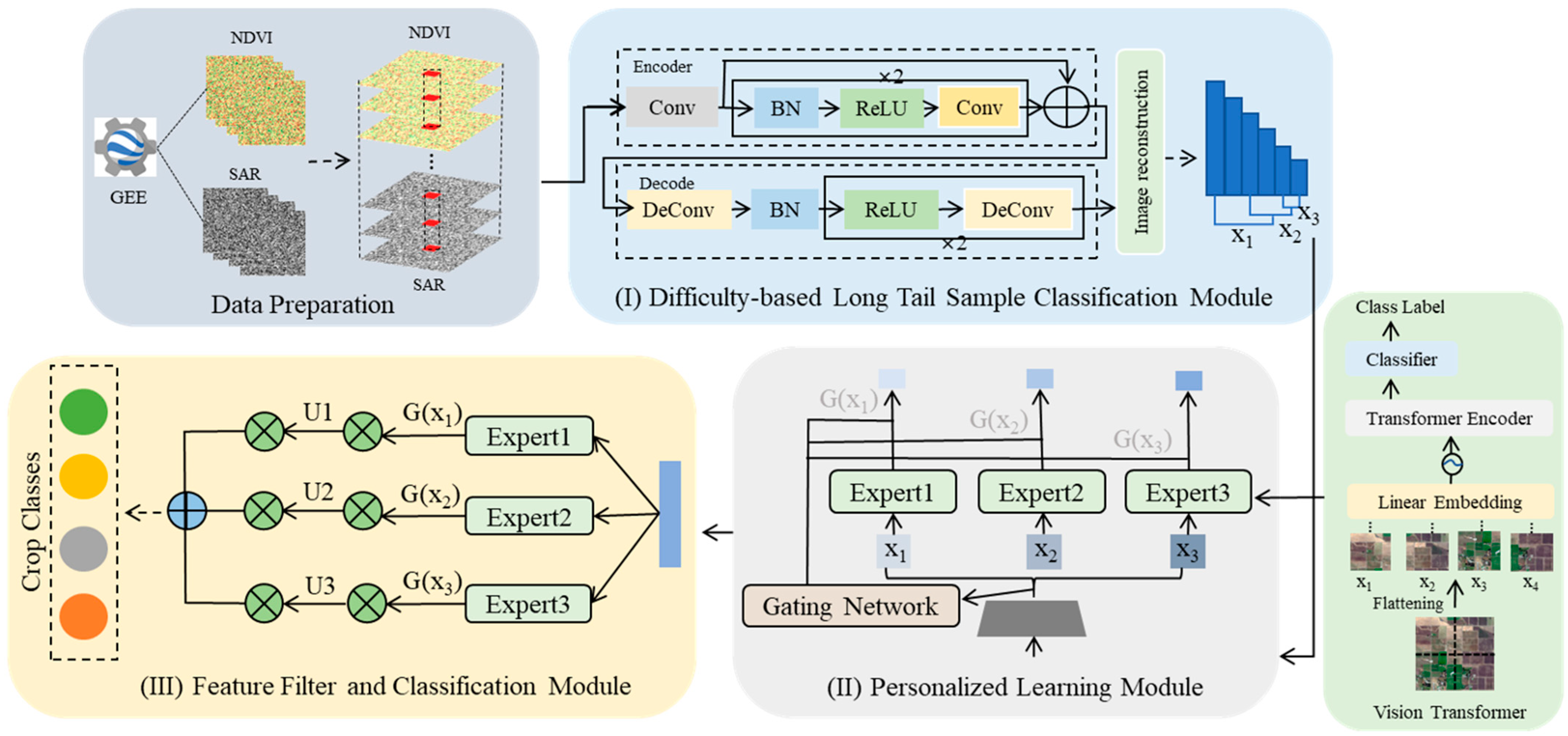 Recent research has employed the Mixture-of-Experts (MoE) framework to tackle this issue. The MoE establishes a network of various specialists, each concentrating on a particular task or data subset, and employs a gating mechanism to select the appropriate experts for classification dynamically. This method can effectively manage sample heterogeneity and improve classification accuracy. In this respect, Lei et al. introduced a multi-level fine-grained crop classification method utilising multi-expert knowledge distillation to tackle classification issues arising from the similarity of crop biological parameters [