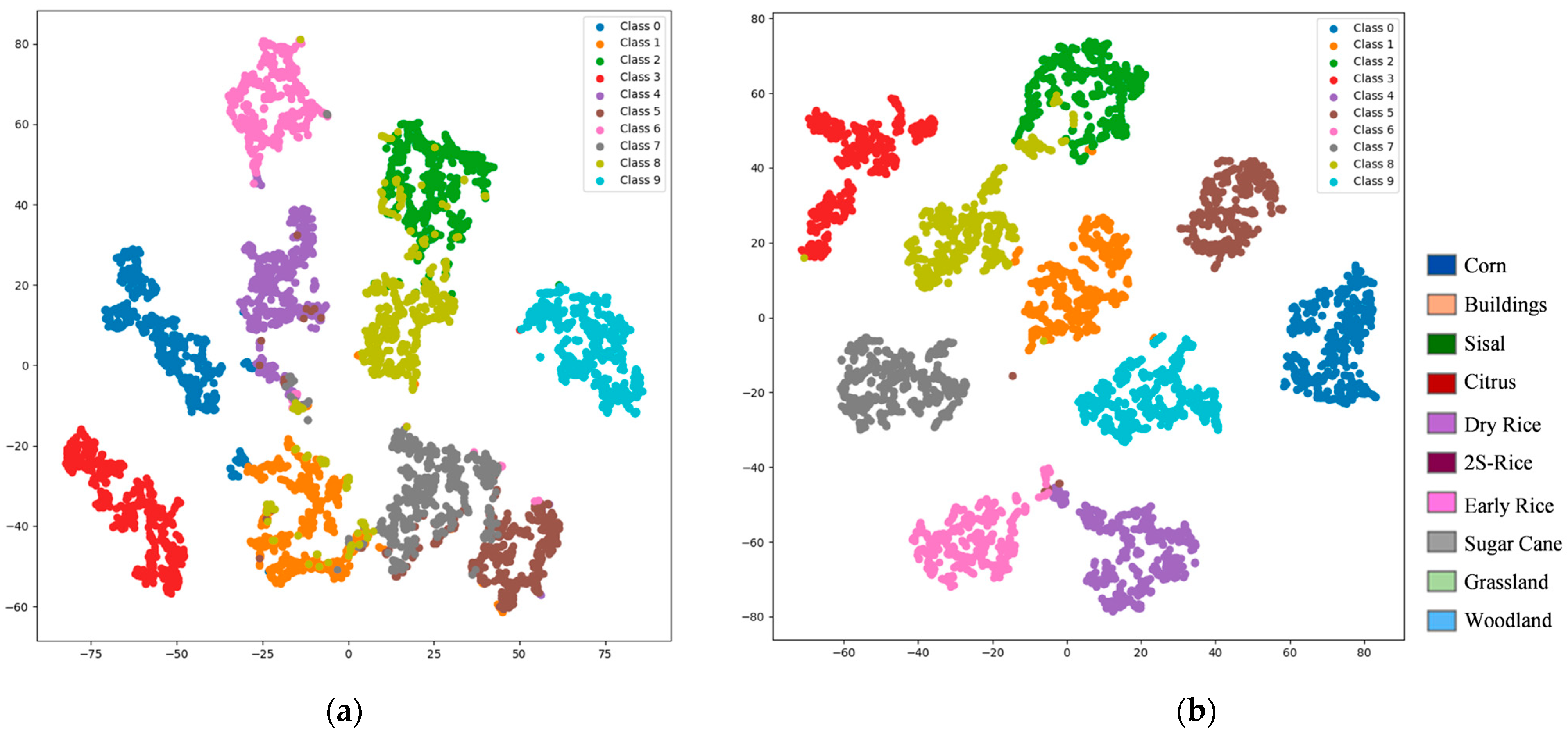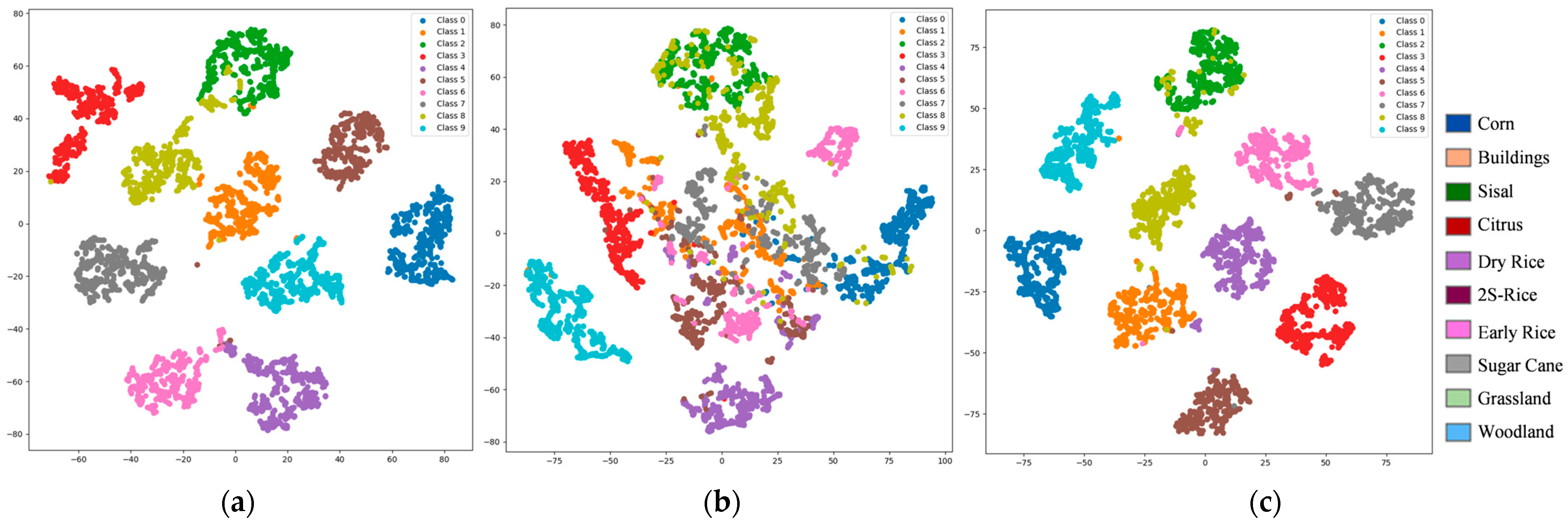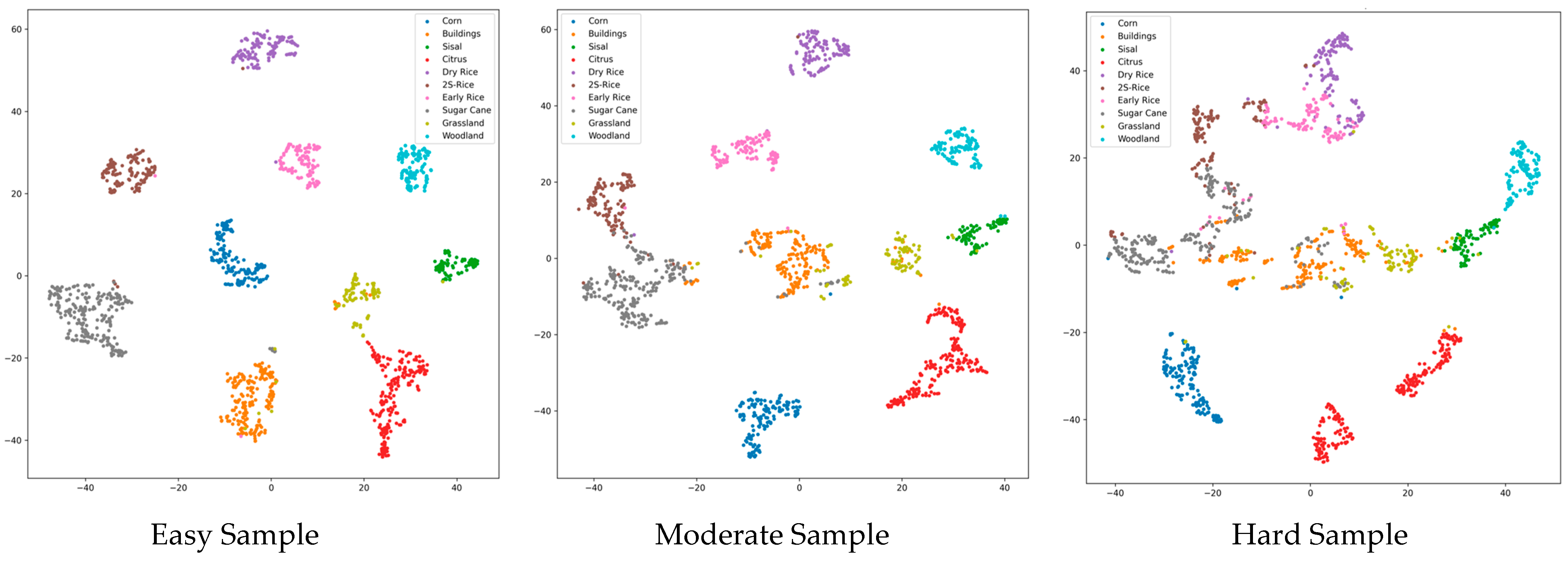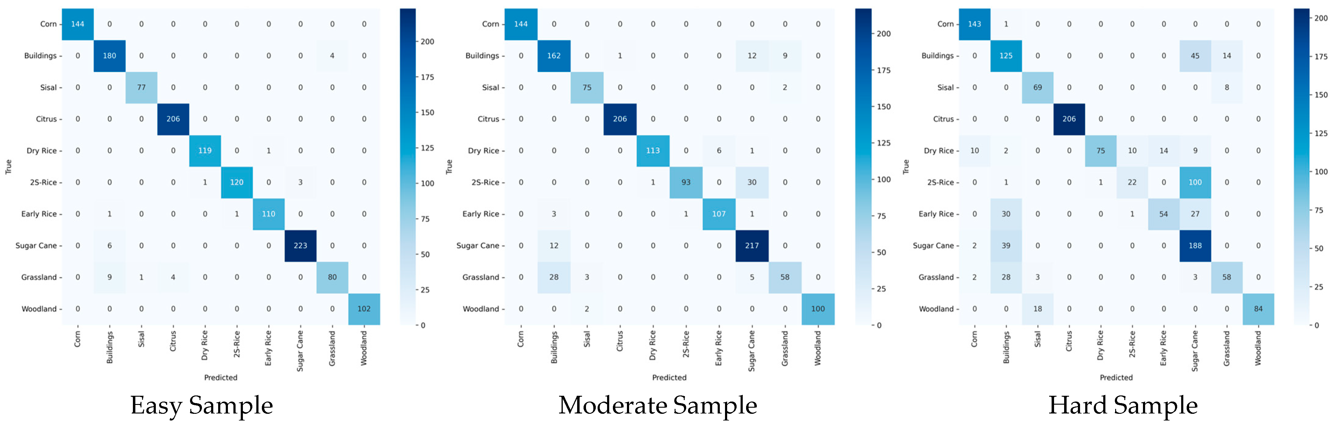 On the other hand, for categories that are relatively easy to classify, such as sisal, woodland, and citrus, there was little change in accuracy, suggesting that the difficulty of distinguishing samples has little effect on these easier categories. At the same time, it also indicates that the difference in sample difficulty has a minimal impact on the classification results for low-difficulty categories. In summary, by comparing the results of the two experiments, we can conclude that the classification accuracy of high-difficulty samples is significantly improved by the difficulty of distinguishing them, especially for categories with high classification difficulty. For simpler classes, the effect of sample difficulty on model performance is relatively small. Therefore, the method of distinguishing sample difficulty has obvious advantages in improving classification accuracy, especially for complex tasks and high-difficulty samples.