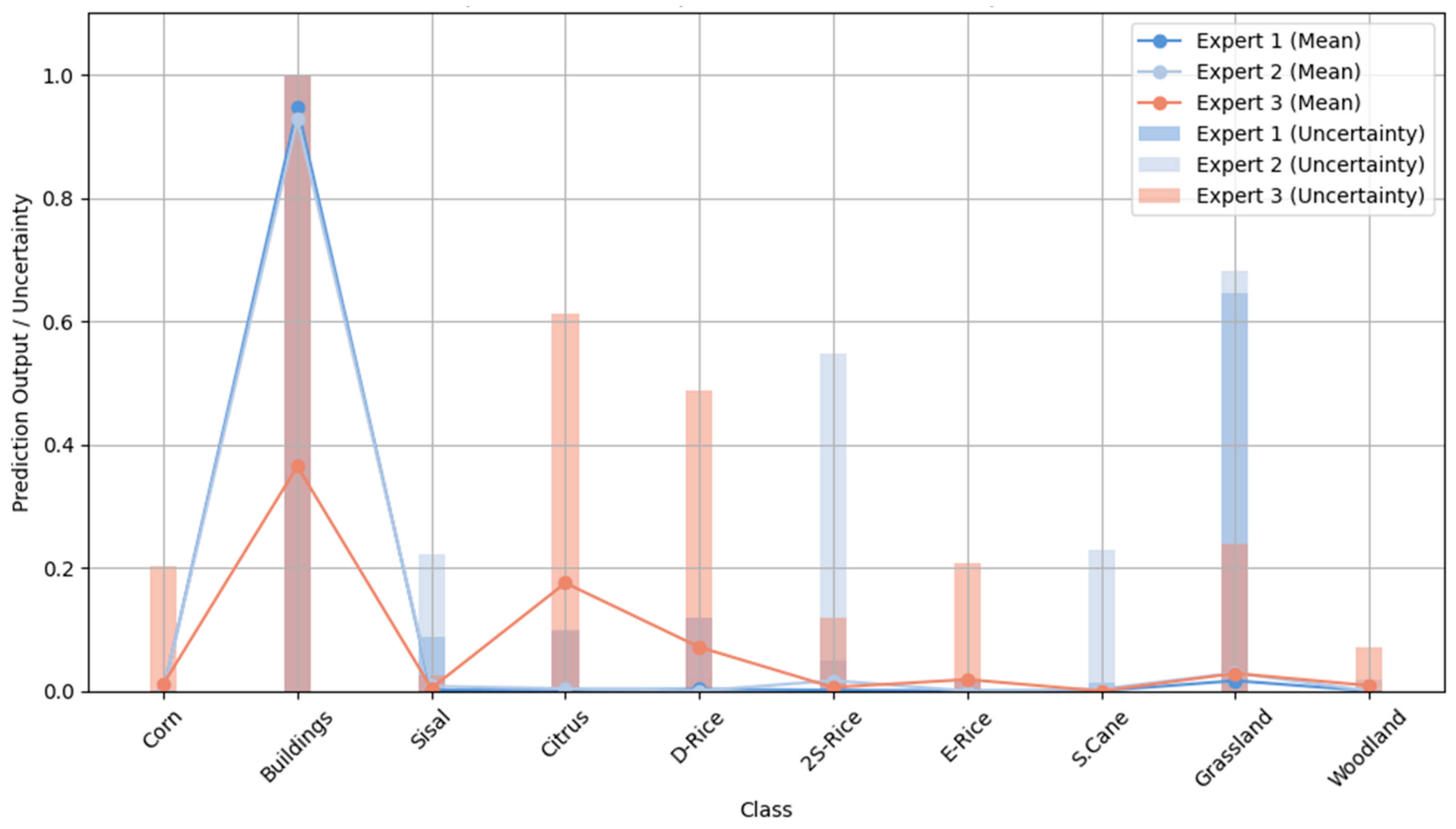 Figure 17. Tail-end challenging categories markedly benefit from expert collaboration; for instance, 2S-Rice surges from 17.74% to 96.77% in the Difficult subset, attributable to Expert-3’s deep modelling of complex spectral features. Similarly, Early Rice (48.21% → 98.21%), Dry Rice (62.50% → 99.17%), Buildings (67.93% → 97.83%), and Grassland (61.70% → 85.11%) achieve dramatic improvements, underscoring the combined contributions of Expert-2 and Expert-3. These categories, characterized by high entropy due to seasonal variations, cropping patterns, or land-cover confusion, represent prototypical long tail complex cases. Although the Difficult subset averages ~70% in isolation, our method—through dynamic weighted fusion via the gating network and uncertainty calibration—transforms potential performance drags into global gains, yielding an ultimate overall OA of 96.4%.