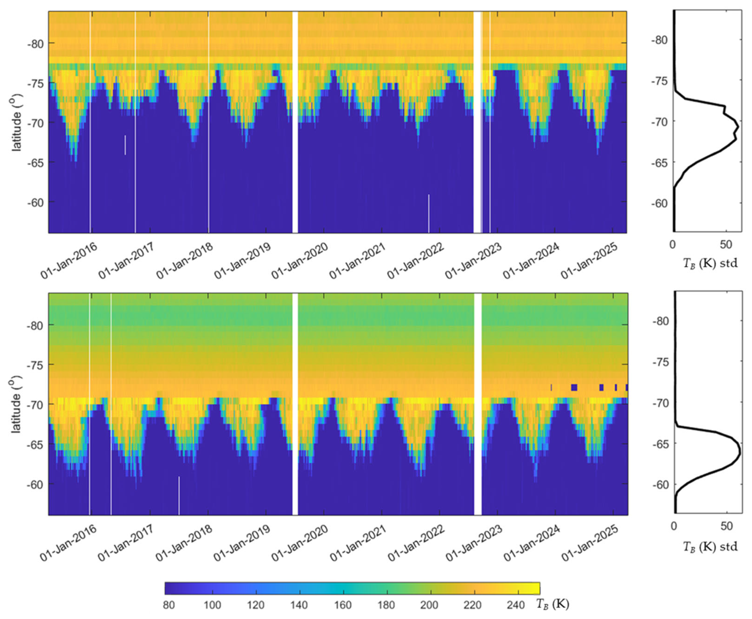 - Surdyk, S. Using microwave brightness temperature to detect short-term surface air temperature changes in Antarctica: An analytical approach. Remote Sens. Environ. 2002, 80, 256–271. [Google Scholar] [CrossRef]