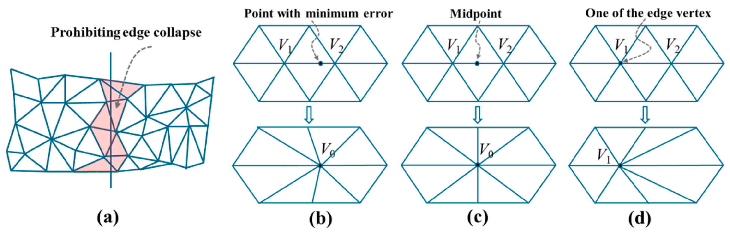 - Garland, M.; Heckbert, P.S. Surface simplification using quadric error metrics. In Proceedings of the 24th Annual Conference on Computer Graphics and Interactive Techniques (SIGGRAPH’97), Anaheim, LA, USA, 3–8 August 1997; pp. 209–216. [Google Scholar]