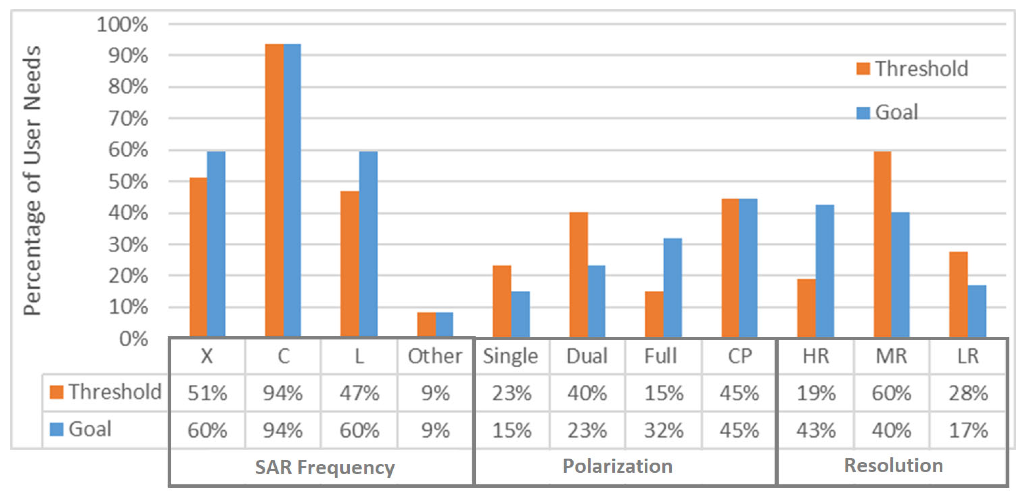 Figure 2. The percentage of user needs for different frequency bands (X, C, L, other), polarization options (Single, Dual, Full, Compact) and resolutions (HR, MR, LR) in HUN analysis for SAR segment.