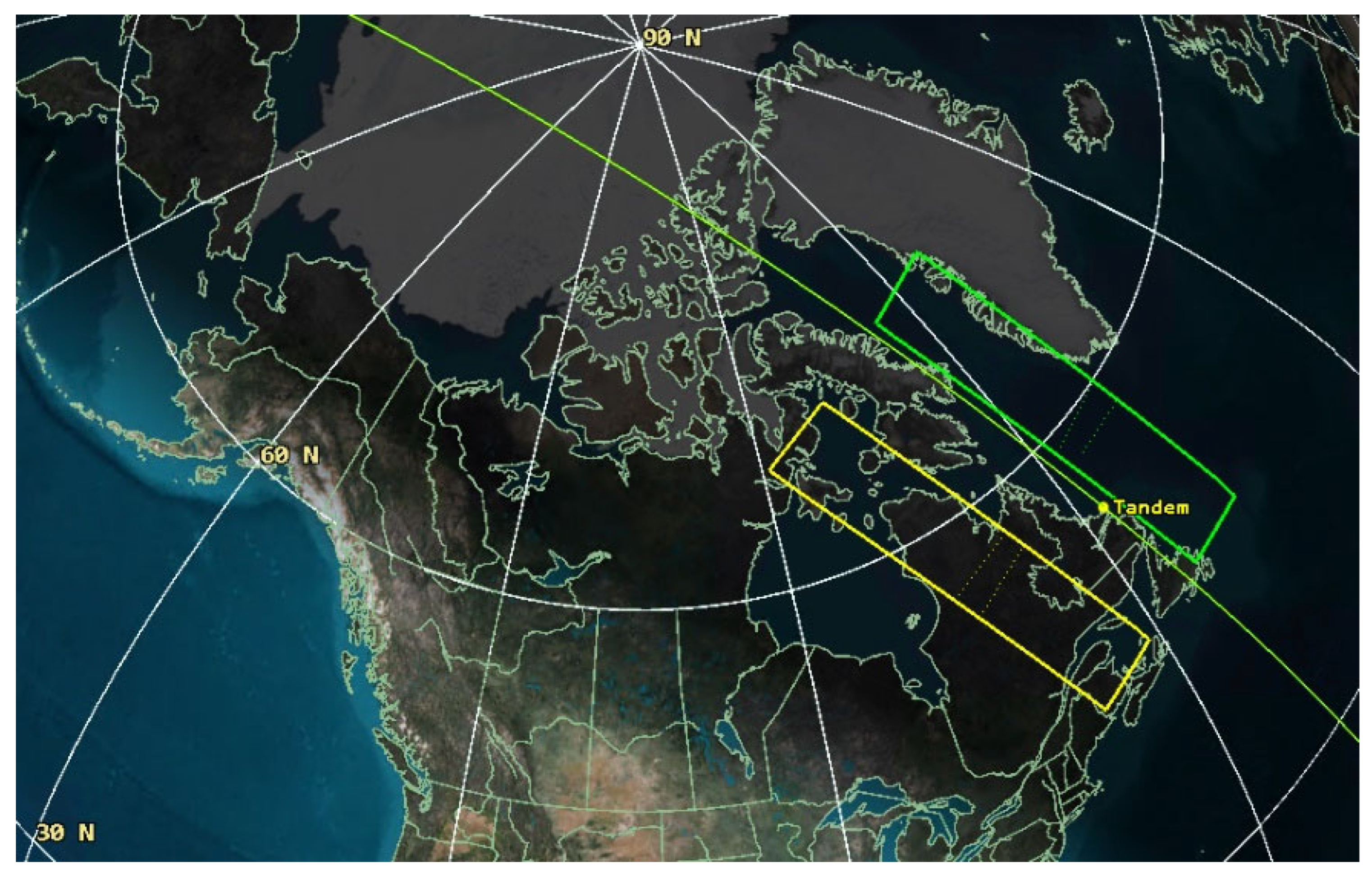 Figure 13. Example of R4G swath along the Arctic, the east coast, and the Atlantic Ocean corresponding to 20 min of duty cycle.