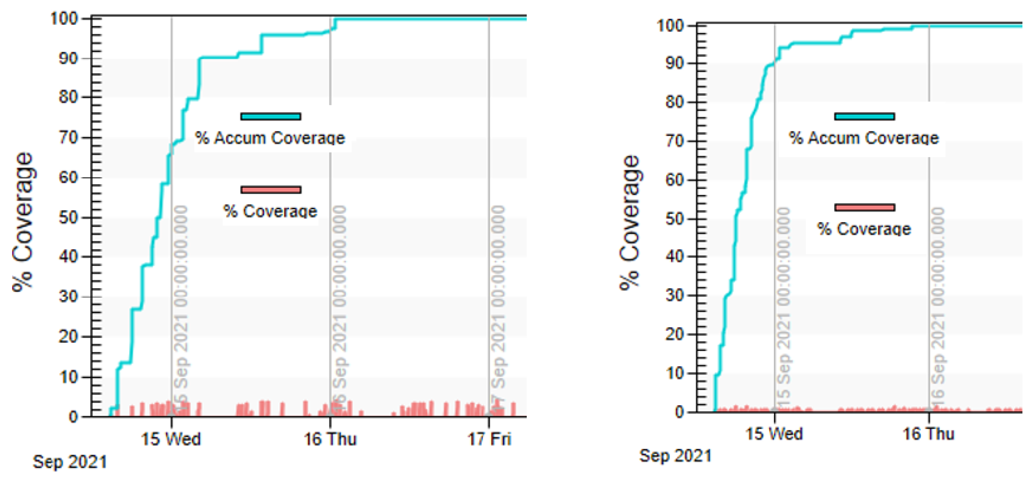 Figure 12. The cumulative average coverage frequency over the Ice Monitoring AOI with the HWRS beam mode: on the left—for three satellites; on the right—for five satellites.