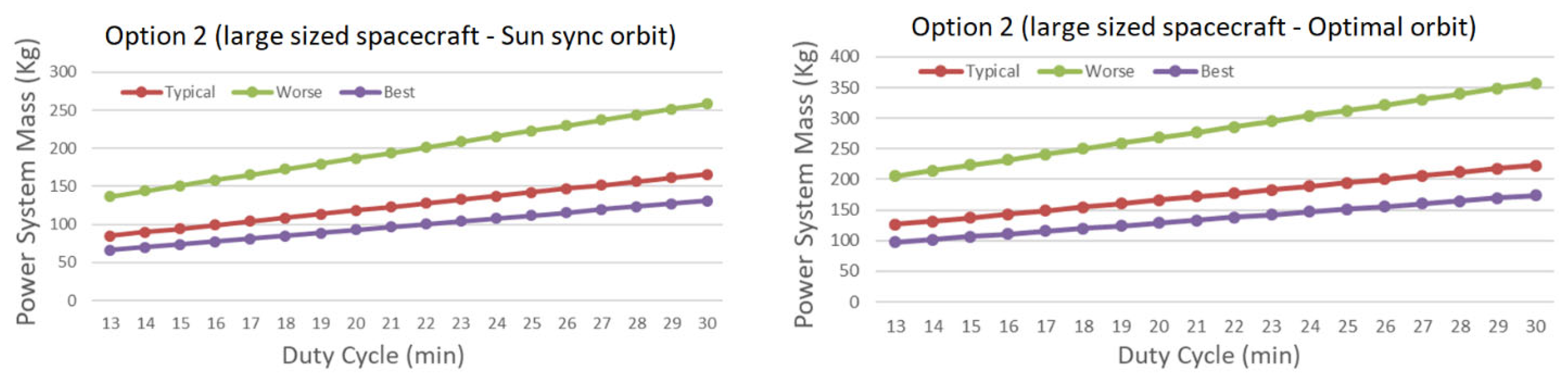 Figure 14. Power system mass as a function of duty cycle for a large-sized satellite in sun-synchronous orbit (left) and optimal orbit (right).
