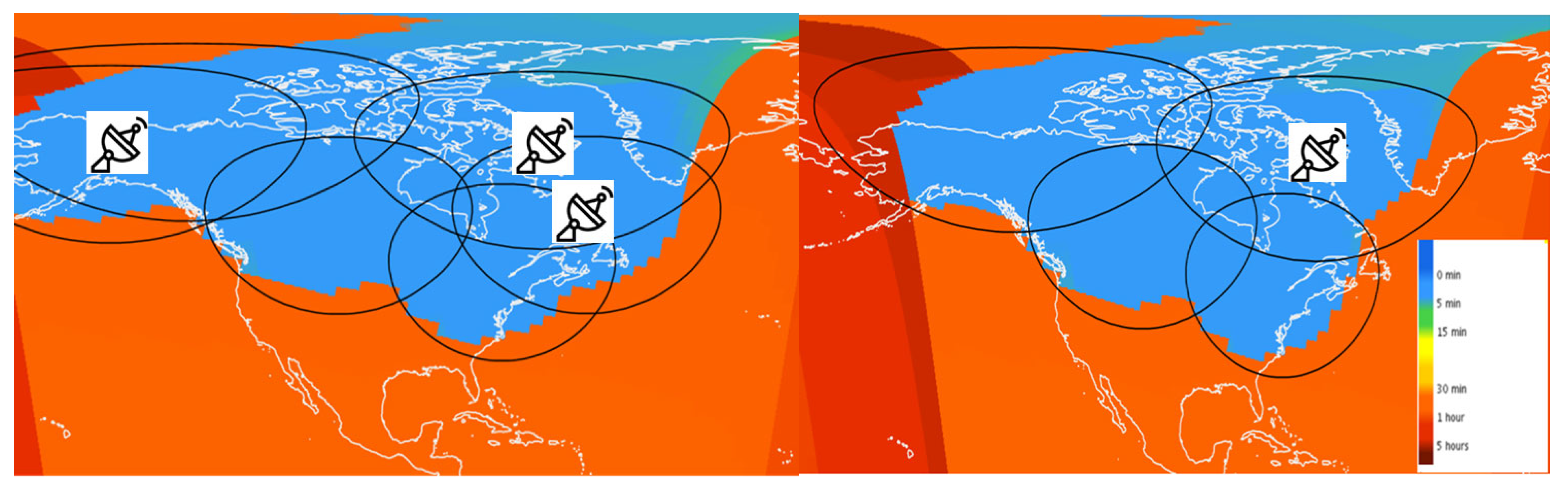 Figure 16. Latency achieved with three NRCan and additional ground stations for worst-case orbit scenario: three additional stations in Happy Valley Goose Bay, Fairbanks, and Iqaluit (left) and one additional station in Iqaluit (right).