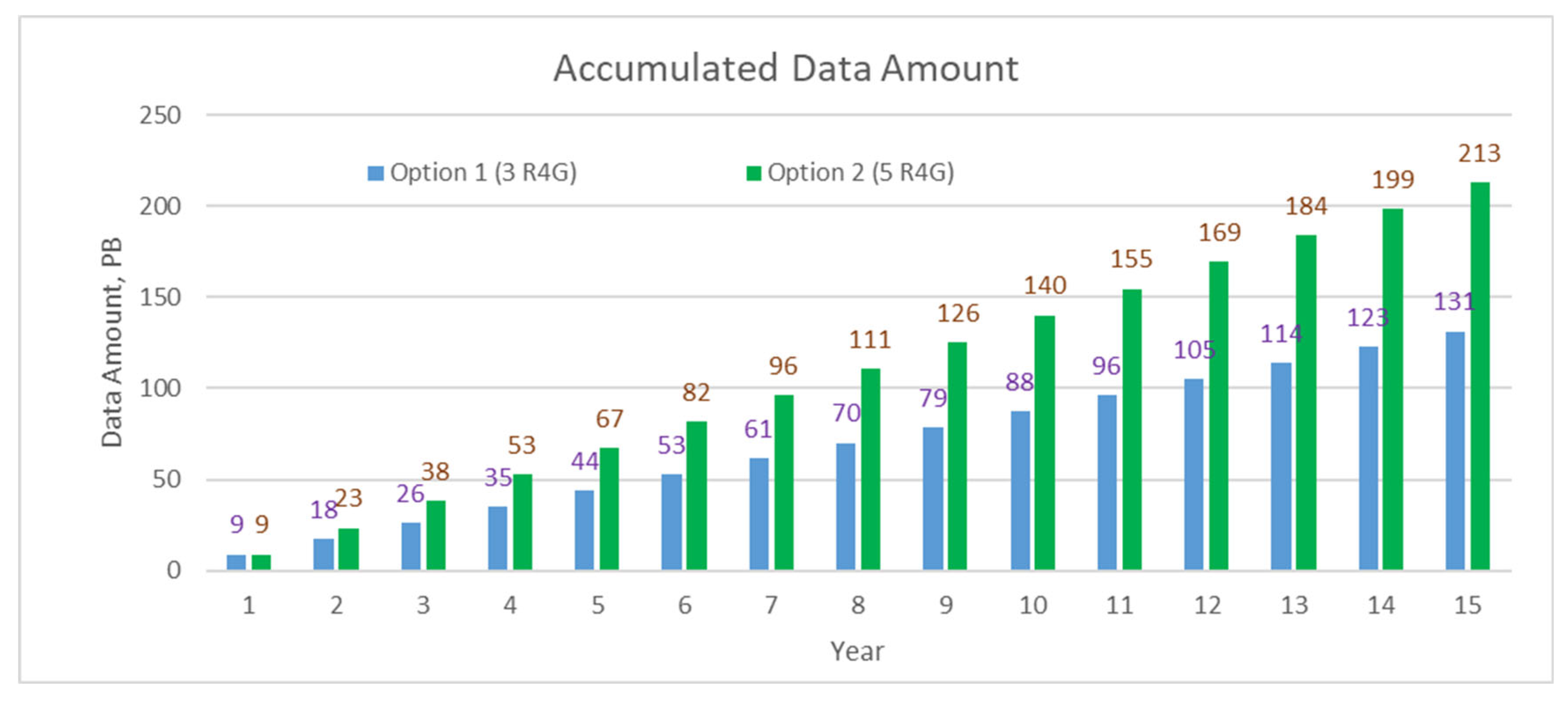 Figure 18. Accumulated data amount (PB) for storage over 15 years of data continuity.