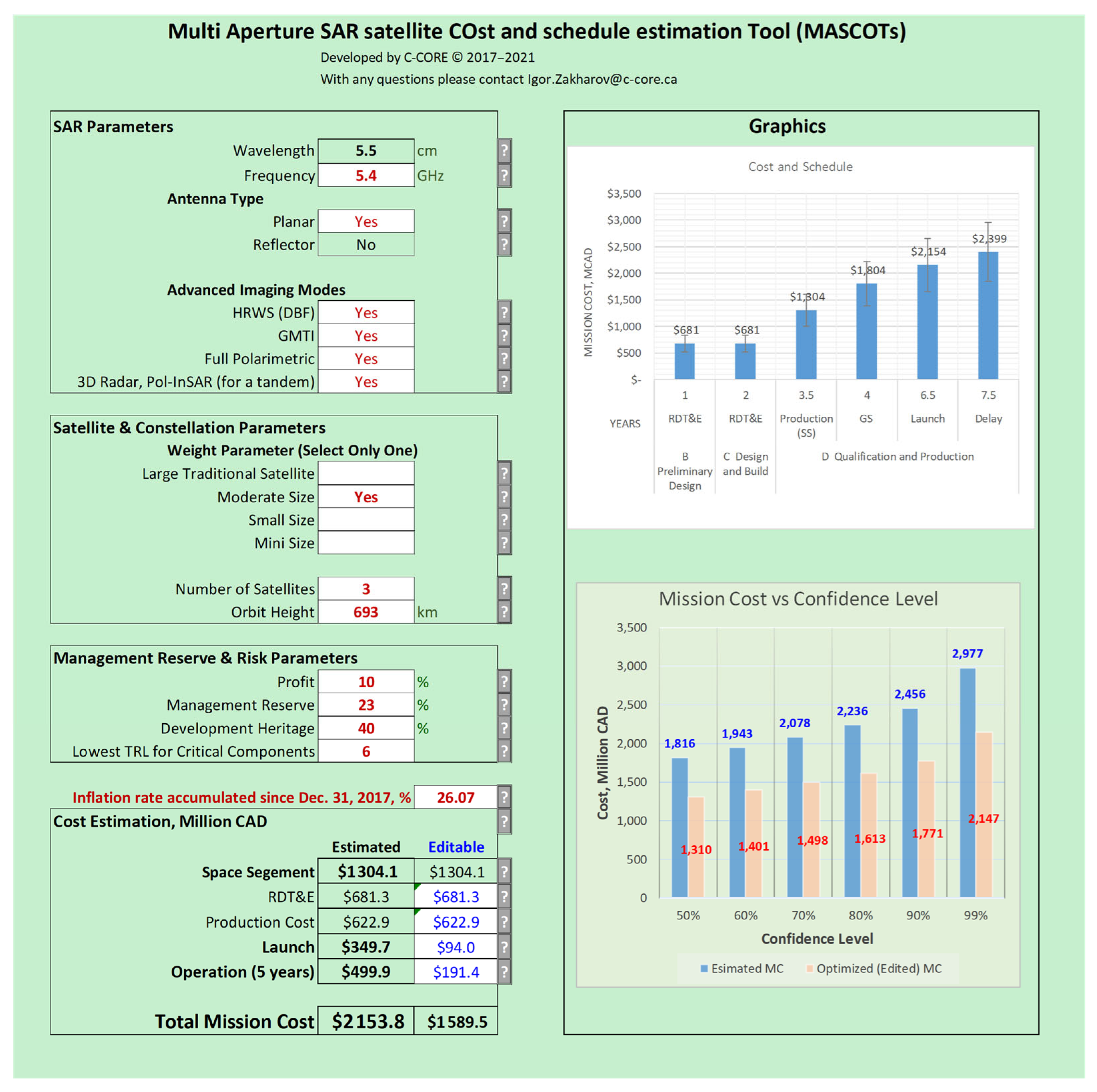 Figure 20. MASCOT's graphic user interface with cost estimations for three moderate (1667 kg) SAR satellites.