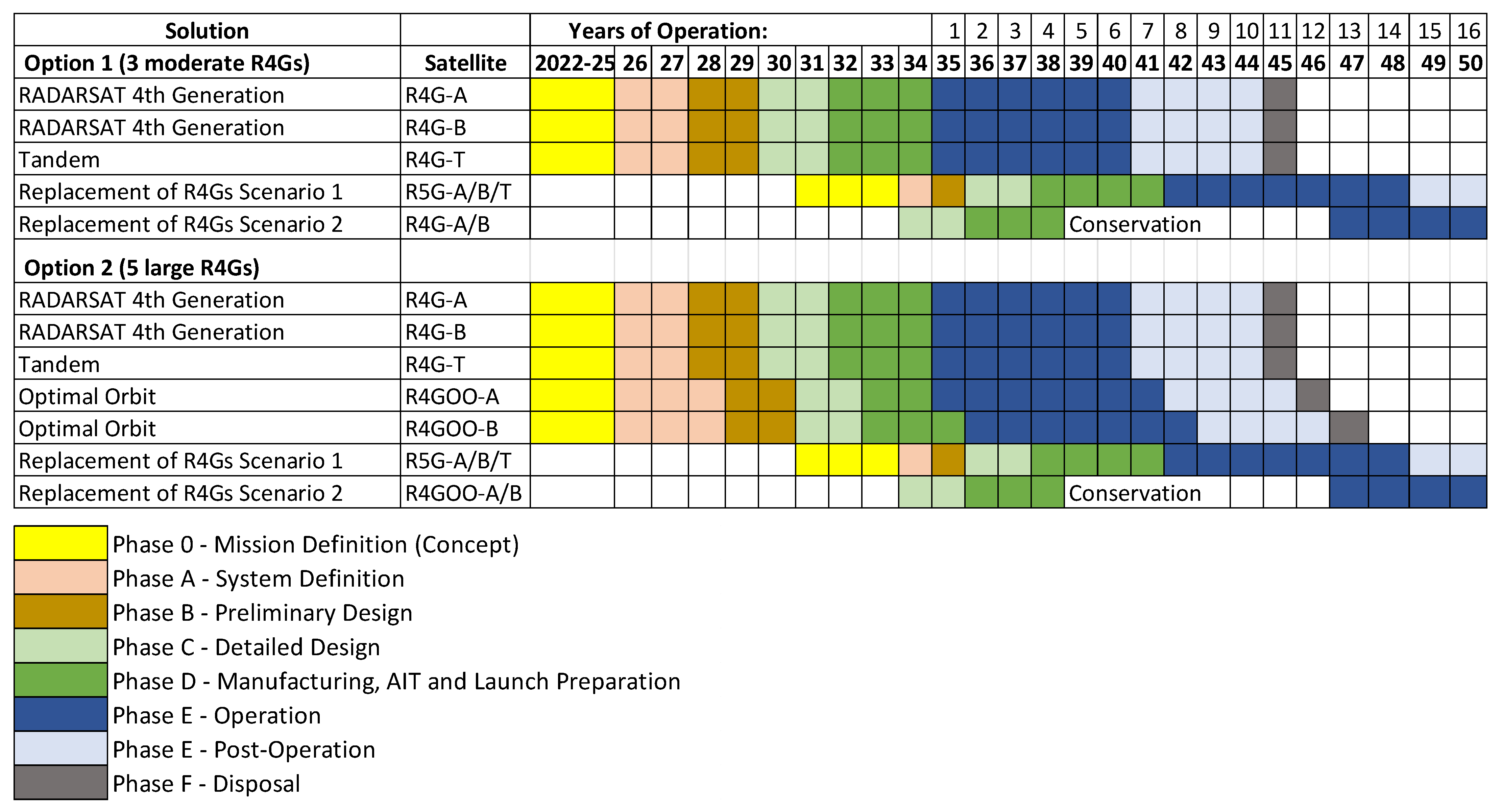 At the same time, MDA has announced that the expected launch of the two CHORUS satellites is 2026 (https://mda.space/chorus (accessed on 15 November 2025)). Since the development of CHORUS was initiated in December 2021 (https://mda.space/en/article/mda-announces-chorus-name-of-its-commercial-earth-observation-mission/ (accessed on 15 November 2025)) and assuming involvement of significant heritage, the entire development process for an advanced SAR mission (based on a large spacecraft) could potentially span about 4 to 7 years. The average durations of mission phases, derived from historical analogs, are considered realistic and are used to establish the SAR mission schedule. However, the design and production of multiple (3–4) large satellites may extend these timelines, with Phase C lasting up to 48 months and Phase D up to 72 months.