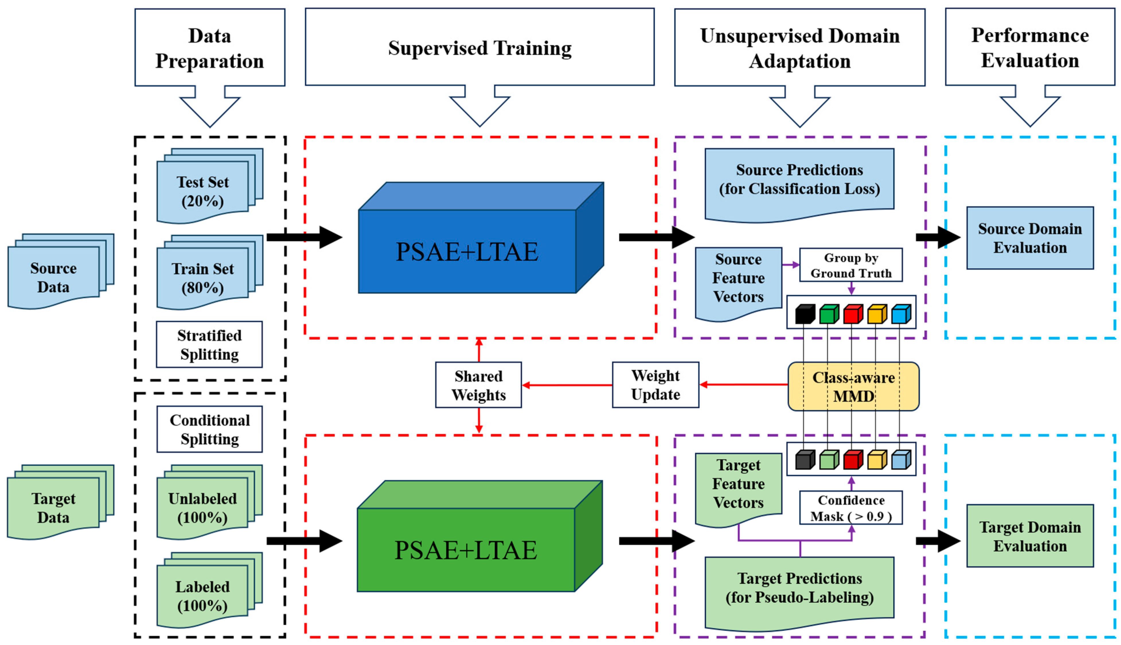 - Supervised Pre-training: In this initial stage, the core PSAE-LTAE model is trained exclusively on the labeled source dataset using a standard supervised learning approach. The PSAE-LTAE, a spatio-temporal feature extractor, first aggregates pixel-level information with its spatial encoder and then models temporal dynamics with its temporal encoder (detailed in Section 3.2). This stage is designed to learn a robust representation of crop spatio-temporal features from the source domain. The model weights that achieve the best performance on a held-out source validation set are saved for the next stage.
