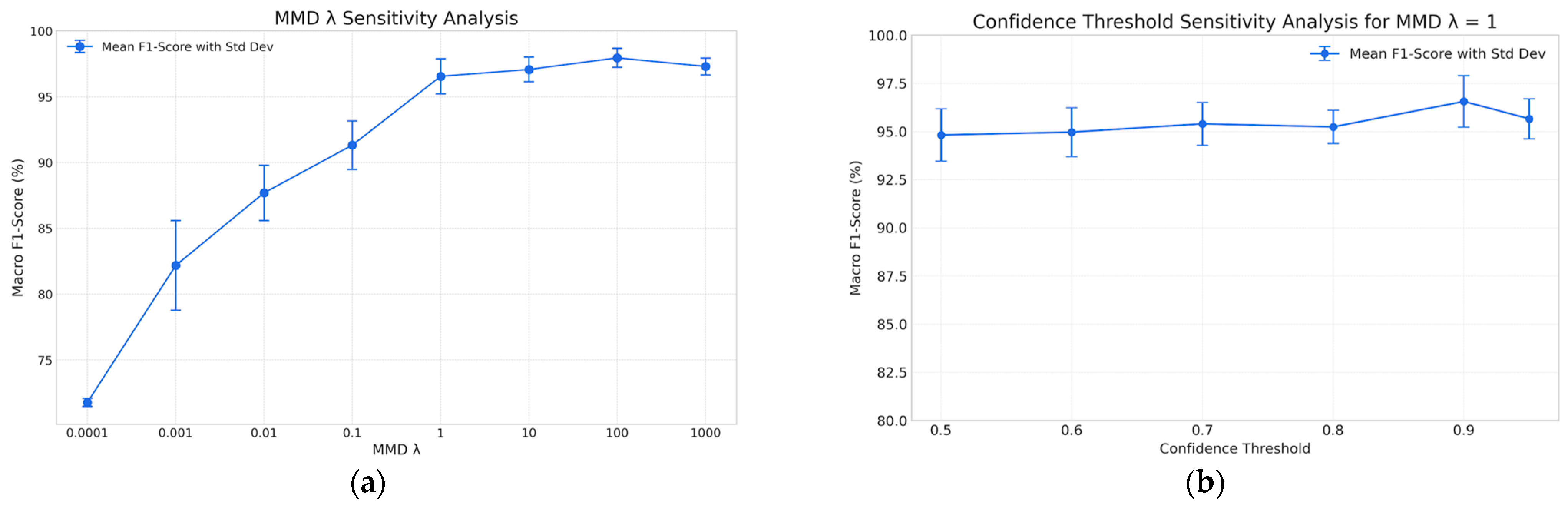 - We set a confidence threshold and select only those high-confidence samples whose predicted probabilities are greater than , along with their pseudo-labels , to be used in the MMD loss calculation.