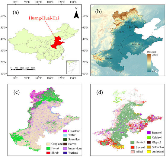 This study was conducted in the Huang-Huai-Hai plain (also known as the North China Plain), one of China’s nine major agricultural zones [30], which is formed by the alluvial deposits of the Yellow River, Huai River, and Hai River and their tributaries, as well as the neighboring southern hilly region of the Shandong Peninsula and the Lunan Hills. The region is located between 32 and 40°N latitude and 114–121°E longitude (Figure 1a), with a total area of approximately 469,500 square kilometers. The topography of the Huang-Huai-Hai plain is dominated by plains, especially the North China Plain and Huang-Huai Plain, characterized by low-lying areas with an elevation typically not exceeding 300 m. The higher-altitude peripheral areas, particularly the mountainous regions in the northwest, form a natural barrier surrounding the central lowland area (Figure 1b). Agricultural production plays a crucial role in the economic development of the Huang-Huai-Hai plain, with major crops including wheat, maize, soybeans, and cotton. Additionally, rice and other economic crops are cultivated in certain areas. The land use types in the region are diverse, including cropland, forests, shrubs, grasslands, water bodies, ice and snow, barren land, impervious surfaces, and wetlands (Figure 1c), with cropland being the dominant land use type. The soil types for cropland in the region are varied, including Luvisol, Alisol, Calcisol, Regosol, Fluvisol, Gleysol, Solonchak, and Anthrosol (Figure 1d). These diverse soil types provide a varied soil environment for crop growth, supporting the different growth requirements of various crops.