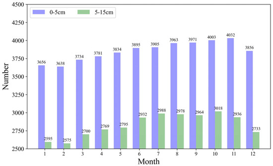 Lembrechts [29] compiled in situ soil temperature measurement data from 9362 independent sensors across 60 countries. Each sensor corresponds to an independent time series, with an average duration of 2.9 years, ranging from 1 month to 41 years, primarily covering the period from 2000 to 2020. In this dataset, all time-series underwent quality control checks, with strict data filtering, for instance, if monthly data contained missing values exceeding one day, such data were excluded. Subsequently, the monthly mean, monthly minimum (5th percentile of all monthly values), and monthly maximum (95th percentile of all monthly values) were calculated. These sensors primarily measured soil temperature at surface (0–5 cm) and subsurface (5–15 cm) depths, with approximately 91% of the data originating from these two depth layers. The collected measurements were averaged into approximately 1200 (surface) and 1000 (subsurface) independent 1 km2 grid cells globally. This study uses data from Lembrechts [29], and given that latitude is a key factor, data from sites located between 30°N and 50°N were selected to align with the geographic scope of the study area, which includes the Huang-Huai-Hai plain (32–40°N). Although the subset corresponding to the Huang-Huai-Hai plain was not reported separately, it lies centrally within the selected latitude range, ensuring that the data is sufficiently representative. The number of available sites for each soil layer, by month, is shown in Figure 2. Both soil layers possess abundant in situ soil temperature data (number of stations), with monthly station numbers ranging from 3638 to 4032 for the shallow layer and 2575 to 3018 for the deep layer. The shallow layer consistently exceeds the deep layer in station numbers by approximately 1000 stations per month across all months.