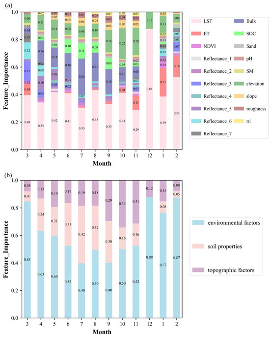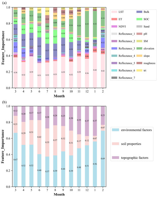 After analyzing the model accuracy, the study further examined the influence of different variables on the 0–5 cm soil temperature. To clearly illustrate seasonal variations, the variables were combined and analyzed into three categories: environmental variables, soil properties, and topographic factors, as shown in Figure 4. The results confirmed that soil temperature is influenced by the combined effect of these three categories of factors, consistent with the findings of Z. Feng [53]. The analysis revealed that the importance of these three factors exhibited distinct seasonal variations. Specifically, environmental variables showed a “decrease-then-increase” trend, with higher contributions in spring and winter (ranging from 0.6 to 0.88), and relatively lower values in summer and autumn (ranging from 0.4 to 0.52). In contrast, the contributions of soil properties and topographic factors exhibited an “increase-then-decrease” trend. Soil properties contributed less in spring and winter (ranging from 0 to 0.24), but significantly increased in summer and autumn, reaching values between 0.16 and 0.42. Topographic factors contributed between 0.08 and 0.19 in spring and winter, and increased to 0.17 to 0.34 in summer and autumn. This complementary seasonal interplay among environmental variables, soil properties, and topographic factors may stem from the following: in spring and winter, low temperature and humidity enhance the importance of environmental variables such as LST and reflectivity; in summer, high temperature and humidity promote microbial activity and nutrient release, strengthening soil properties; and in autumn, topographic factors gain prominence due to their influence on localized water and nutrient distribution, such as retention or loss. As shown in Figure 4a, among the environmental variables, LST consistently showed high contributions throughout the year, fluctuating between 0.29 and 0.88. It reached its highest value of 0.88 in December during winter, while it dropped to its lowest point of 0.29 in November during autumn, exhibiting a distinct seasonal fluctuation. ET had a more significant impact in late autumn, winter, and early spring, with the highest contribution of 0.21 in January, second only to LST within the environmental variables. Additionally, Reflectance_3 had the most notable influence in early spring, with a contribution of 0.15. Among the soil properties, Bulk density played a dominant role, and along with SOC, its contribution increased significantly in summer and early autumn, reaching the highest values of 0.26 and 0.11, respectively, in July. Among the topographic factors, elevation had the most significant contribution throughout the year, with the highest value of 0.22 in October during autumn.