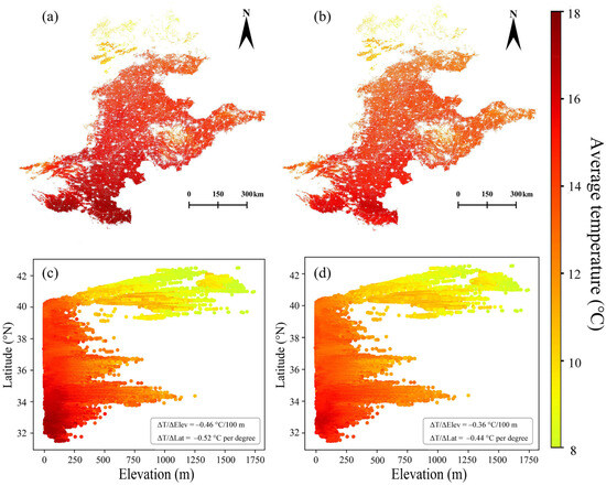 Spatial distribution of the 18-year average soil temperature. (a,b) show the spatial distribution of the 18-year average soil temperature at 0–5 cm and 5–15 cm depths, respectively. (c,d) show the relationships of soil temperature at 0–5 cm and 5–15 cm depths with latitude and elevation, respectively.