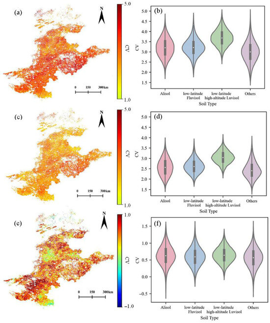 Spatial distribution of variability. (a,b) show CV and comparison across four soil types for the 0–5 cm layer, respectively; (c,d) show the same for the 5–15 cm layer. (e,f) show the CV difference between the two soil layers and comparison across four soil types, respectively.