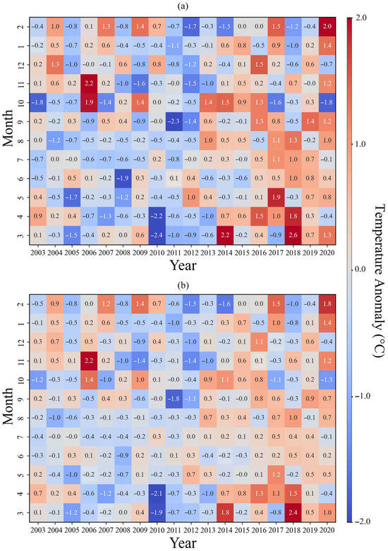 Monthly temperature anomalies in the study area for 0–5 cm (a) and 5–15 cm (b), respectively.